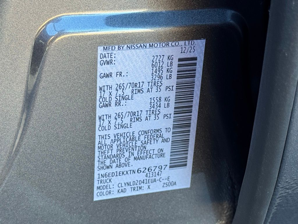 PRO-4X Convenience Package, 4WD, 17" Painted Alloy Wheels, 3.692 Axle Ratio, 4-Wheel Disc Brakes, 6 Speakers, ABS brakes, Air Conditioning, Alloy wheels, AM/FM radio: SiriusXM, Anti-whiplash front head restraints, Auto High-beam Headlights, Automatic temperature control, Blind Spot Warning, Brake assist, Bumpers: body-color, Delay-off headlights, Driver door bin, Driver vanity mirror, Dual front impact airbags, Dual front side impact airbags, Electronic Stability Control, Electronic Tailgate Lock, Emergency communication system, Essentials Kit, Front anti-roll bar, Front Bucket Seats, Front Center Armrest, Front dual zone A/C, Front fog lights, Front reading lights, Front wheel independent suspension, Fully automatic headlights, Heated Front Bucket Seats, Heated front seats, Heated steering wheel, Illuminated entry, Knee airbag, Leather steering wheel, Low tire pressure warning, Mud Flaps, Occupant sensing airbag, Off-Road Style Step Rails, Overhead airbag, Overhead console, Panic alarm, Passenger door bin, Passenger vanity mirror, Power door mirrors, Power driver seat, Power passenger seat, Power steering, Power windows, PRO Embroidered Premium Cloth Seat Trim, Radio data system, Rear anti-roll bar, Rear seat center armrest, Rear side impact airbag, Rear step bumper, Remote keyless entry, Security system, Speed control, Speed-sensing steering, Split folding rear seat, Steering wheel mounted audio controls, Tachometer, Telescoping steering wheel, Tilt steering wheel, Traction control, Trip computer, Variably intermittent wipers, Voltmeter, and Wireless Apple CarPlay/Wireless Android Auto. Price includes all rebates: $3500 - Nissan Customer Cash. Exp. 05/04/2026