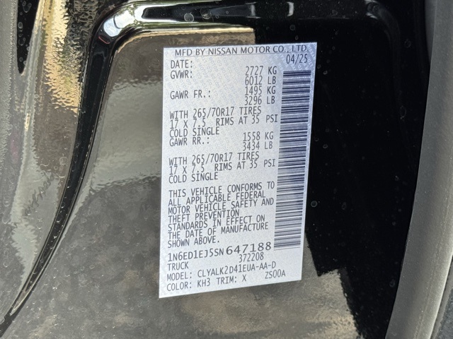 Super Black 2025 Nissan Frontier PRO-X RWD 9-Speed Automatic with Overdrive 3.8L DI DOHC 24V V6 This Vehicle qualifies for Complimentary 10 YEARS or 250,000 MILE LIMITED POWER TRAIN WARRANTY. HUGE VALUE! Visit dealer for complete details.