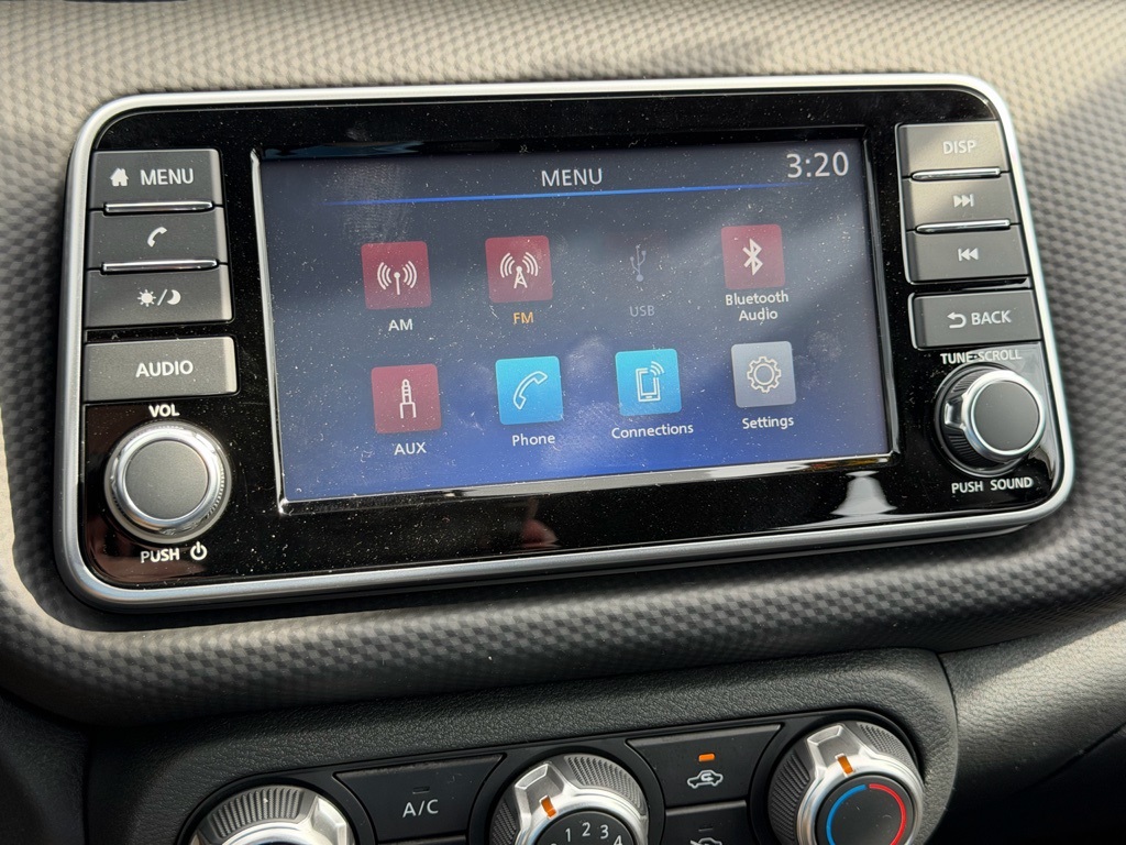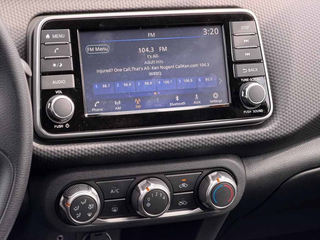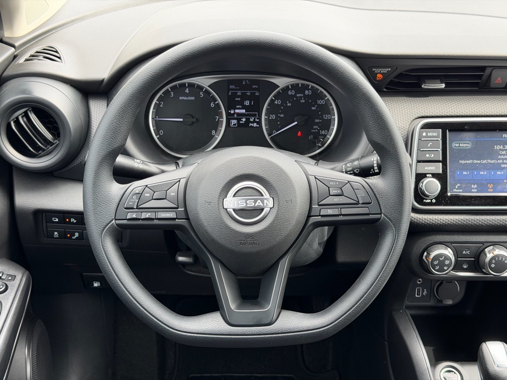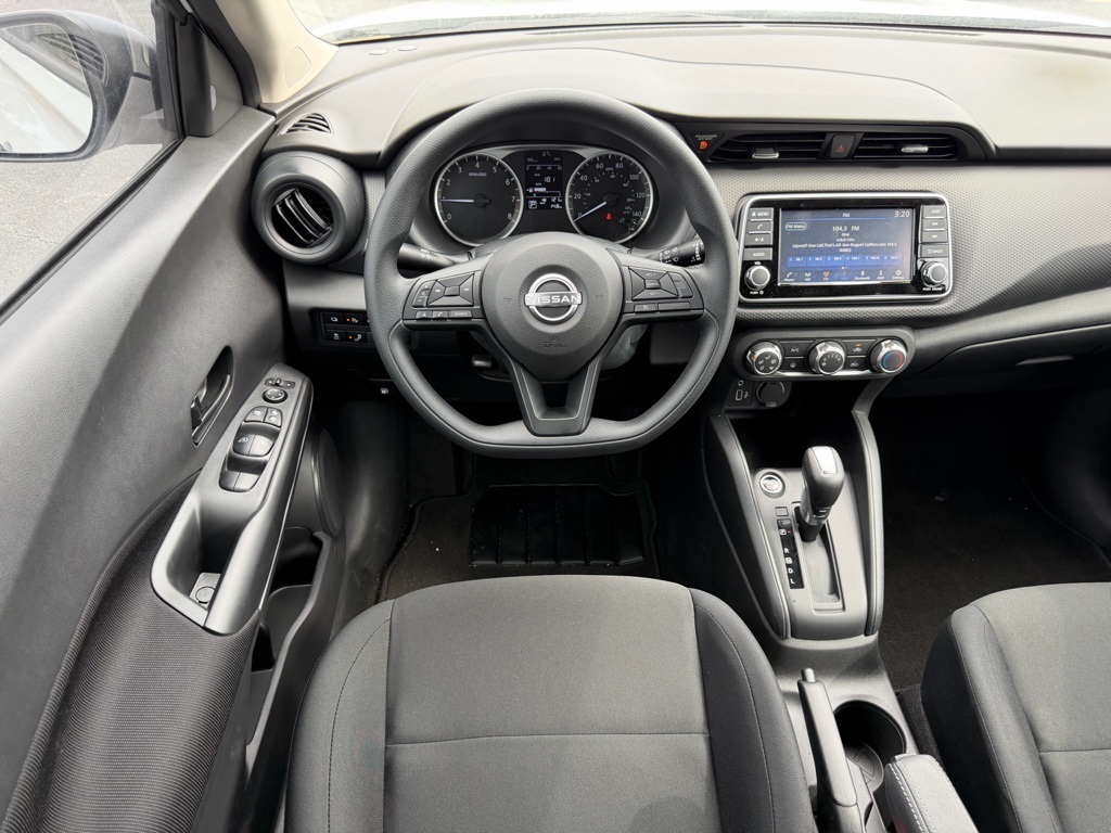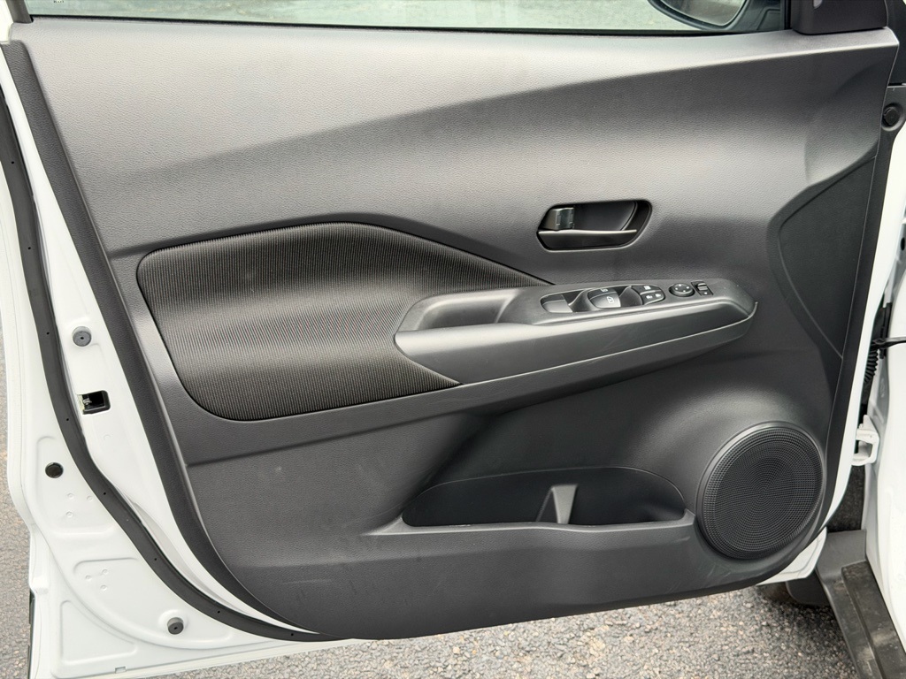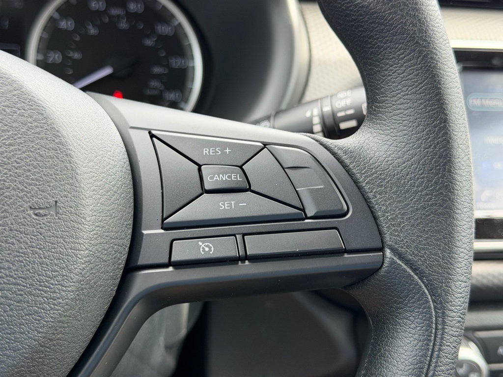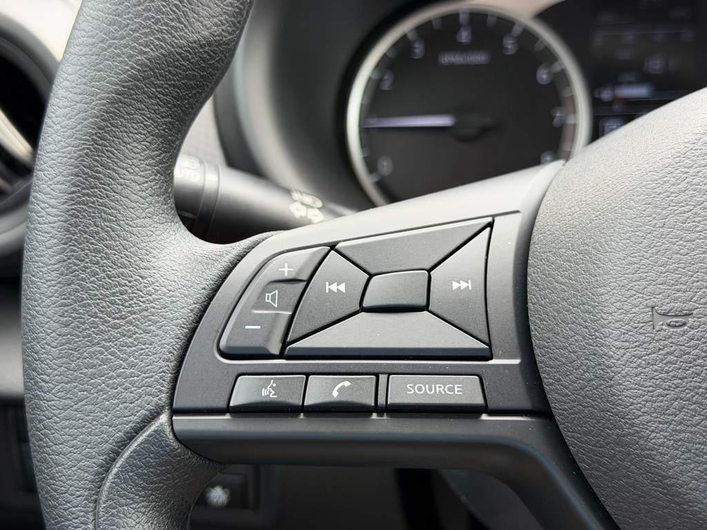 16" Steel Wheels with Full Covers, 6 Speakers, ABS brakes, Air Conditioning, AM/FM Audio System, AM/FM radio, Apple CarPlay/Android Auto, Auto High-beam Headlights, Blind Spot Warning, Brake assist, Bumpers: body-color, Carpeted Floor Mats with Cargo Mat, Center Armrest with Storage, Cloth Seat Trim with Single Stitch, Driver door bin, Driver vanity mirror, Driver's Seat Mounted Armrest, Dual front impact airbags, Dual front side impact airbags, Electronic Stability Control, Front anti-roll bar, Front Bucket Seats, Front reading lights, Front wheel independent suspension, Fully automatic headlights, Illuminated entry, Knee airbag, Low tire pressure warning, Occupant sensing airbag, Outside temperature display, Overhead airbag, Panic alarm, Passenger door bin, Passenger vanity mirror, Power door mirrors, Power steering, Power windows, Radio data system, Rear Parking Sensors, Rear reading lights, Rear side impact airbag, Rear window defroster, Rear window wiper, Remote keyless entry, Speed control, Splash Guards Grain (4 Piece), Split folding rear seat, Sport steering wheel, Steering wheel mounted audio controls, Tachometer, Telescoping steering wheel, Tilt steering wheel, Traction control, Trip computer, USB Charging Cable Set - Nissan, and Variably intermittent wipers.