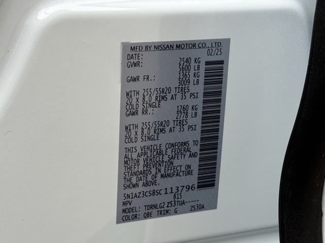 10 Speakers, 20" Alloy Wheels, 4-Wheel Disc Brakes, ABS brakes, Air Conditioning, Alloy wheels, AM/FM radio: SiriusXM w/360L, Auto High-beam Headlights, Auto-dimming Rear-View mirror, Automatic temperature control, Brake assist, Bumpers: body-color, Carpeted Floor & Cargo Mats, Child-Seat-Sensing Airbag, Compass, Delay-off headlights, Driver door bin, Driver vanity mirror, Dual front impact airbags, Dual front side impact airbags, Electronic Stability Control, Emergency communication system: NissanConnect Services, Four wheel independent suspension, Front anti-roll bar, Front Bucket Seats, Front Center Armrest, Front dual zone A/C, Front reading lights, Fully automatic headlights, Garage door transmitter: myQ Connected Garage, Grained Splash Guards, Heated door mirrors, Heated Front Bucket Seats, Heated front seats, Heated steering wheel, Illuminated entry, Knee airbag, Low tire pressure warning, Memory seat, Navigation system: NissanConnect with Navigation and Services, Occupant sensing airbag, Outside temperature display, Overhead airbag, Overhead console, Panic alarm, Passenger door bin, Passenger vanity mirror, Power door mirrors, Power driver seat, Power Liftgate, Power moonroof: Panoramic, Power passenger seat, Power steering, Power windows, Premium Paint, PVC (Leatherette) Seat Trim, Radio data system, Radio: NissanConnect w/Hybrid Radio, Rear anti-roll bar, Rear reading lights, Rear seat center armrest, Rear side impact airbag, Rear window defroster, Rear window wiper, Remote keyless entry, Security system, Speed control, Speed-Sensitive Wipers, Split folding rear seat, Spoiler, Steering wheel mounted audio controls, Tachometer, Telescoping steering wheel, Tilt steering wheel, Traction control, Trip computer, Turn signal indicator mirrors, Variably intermittent wipers, and Wireless Apple CarPlay/Wireless Android Auto.