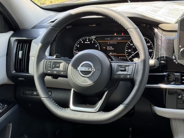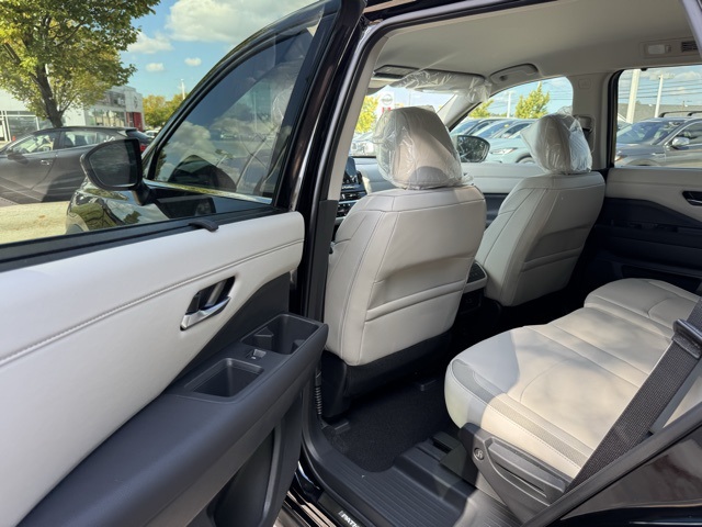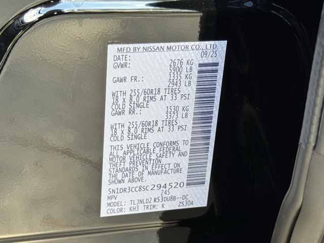 Black Appearance Package (Black Grille and Black Liftgate Emblems), Cargo Package (Cargo Area Protector, Cargo Net, and First Aid), Lighting Package (N92) (Illuminated Kick Plate and Welcome Lighting), 3rd row seats: bench, 4-Wheel Disc Brakes, 6 Speakers, ABS brakes, Air Conditioning, Alloy wheels, AM/FM radio: SiriusXM, Auto High-beam Headlights, Auto-dimming Rear-View mirror, Automatic temperature control, Bench Seat Carpeted Floor Mats (Set of 4), Brake assist, Bumpers: body-color, Delay-off headlights, Driver door bin, Driver vanity mirror, Dual front impact airbags, Dual front side impact airbags, Electronic Stability Control, Emergency communication system, Exterior Parking Camera Rear, Four wheel independent suspension, Front anti-roll bar, Front Bucket Seats, Front Center Armrest, Front dual zone A/C, Front reading lights, Fully automatic headlights, Garage door transmitter: HomeLink, Heated door mirrors, Heated Front Bucket Seats, Heated front seats, Heated steering wheel, Illuminated entry, Knee airbag, Leather steering wheel, Leather-Appointed Seating Surfaces, LED Fog Lamps, Low tire pressure warning, Navigation system: NissanConnect with Navigation and Services, Nissan USB Charging Cable Set, NissanConnect featuring Apple CarPlay and Android Auto, NissanConnect w/Navigation & Services, Occupant sensing airbag, Outside temperature display, Overhead airbag, Overhead console, Panic alarm, Passenger door bin, Passenger vanity mirror, Power door mirrors, Power driver seat, Power Liftgate, Power passenger seat, Power steering, Power windows, Radio data system, Radio: AM/FM Audio System, Rear air conditioning, Rear anti-roll bar, Rear reading lights, Rear seat center armrest, Rear side impact airbag, Rear window defroster, Rear window wiper, Reclining 3rd row seat, Remote keyless entry, Security system, Speed control, Speed-sensing steering, Split folding rear seat, Spoiler, Steering wheel mounted audio controls, Tachometer, Telescoping steering wheel, Tilt steering wheel, Traction control, Trip computer, Turn signal indicator mirrors, Variably intermittent wipers, and Wheels: 18" x 8J Machined Alloy.