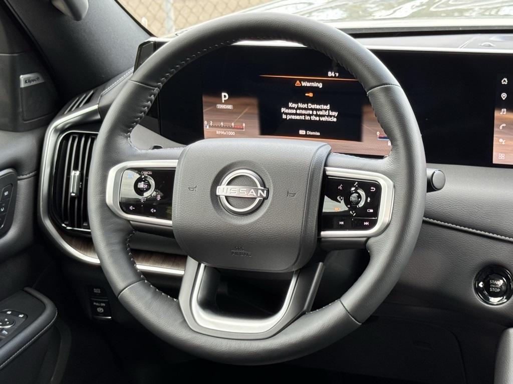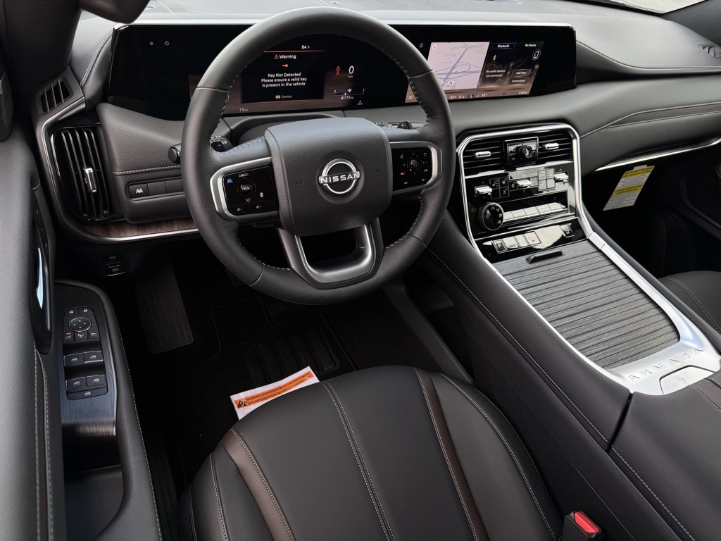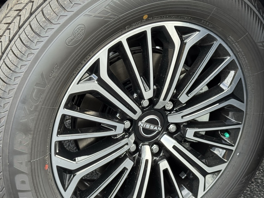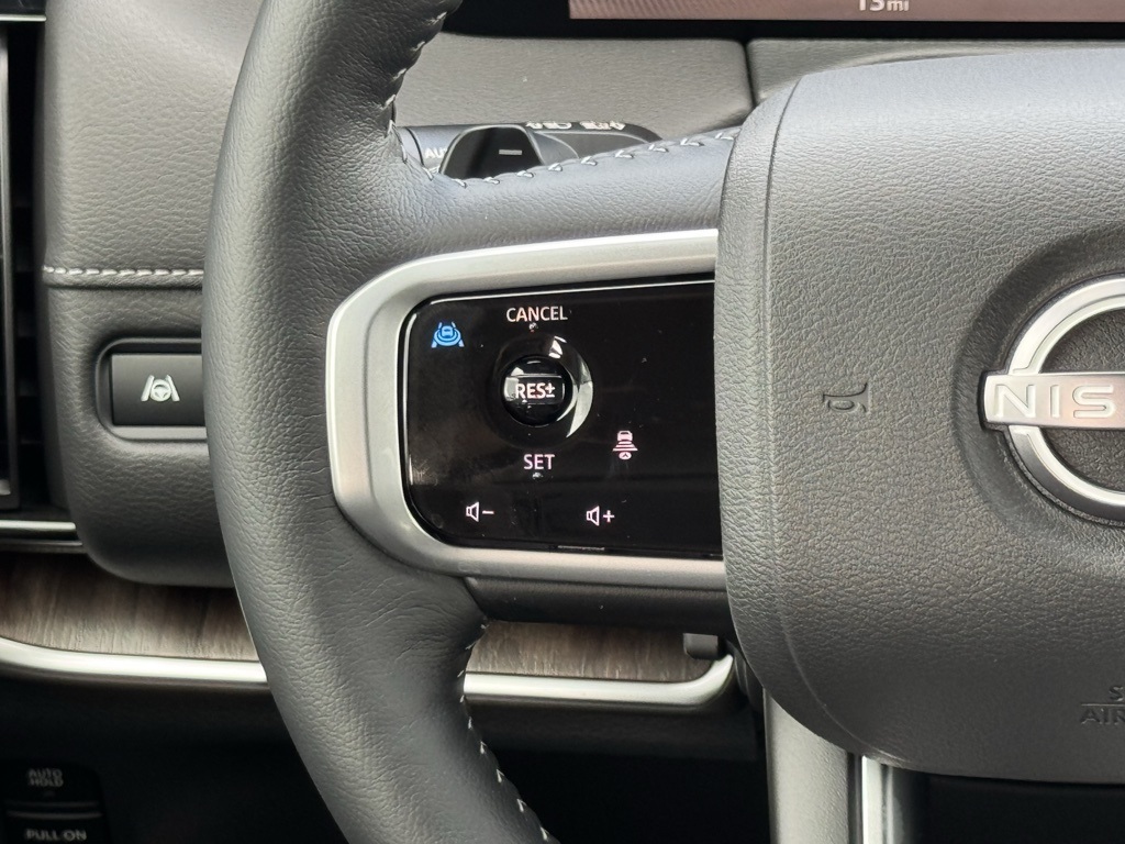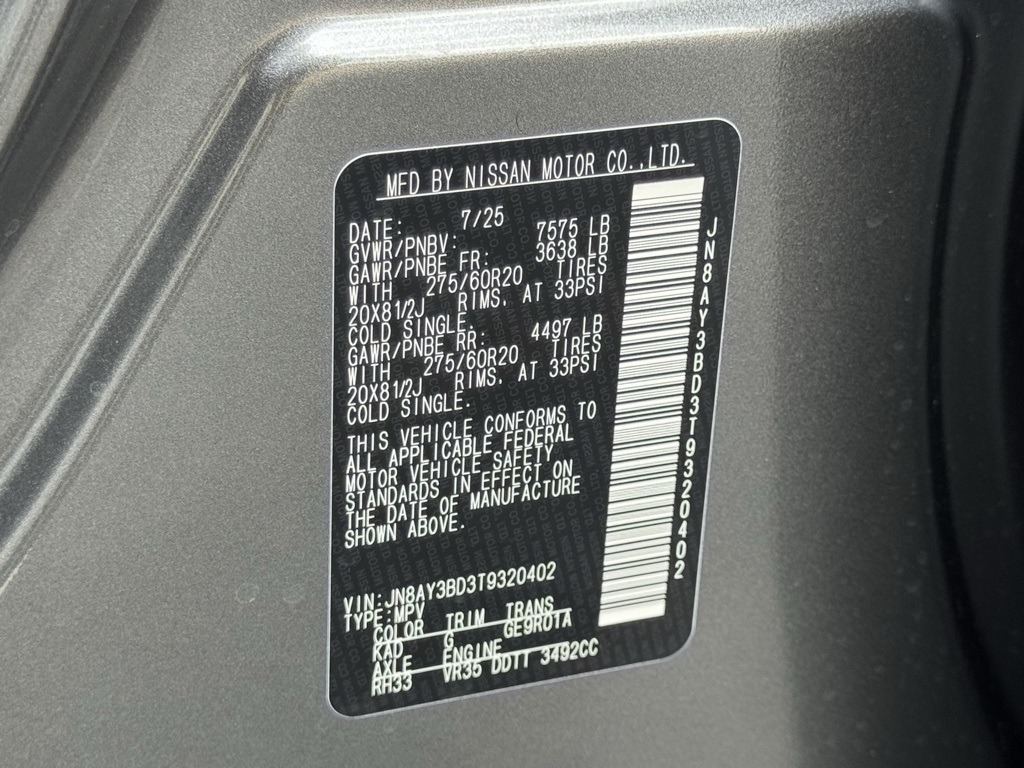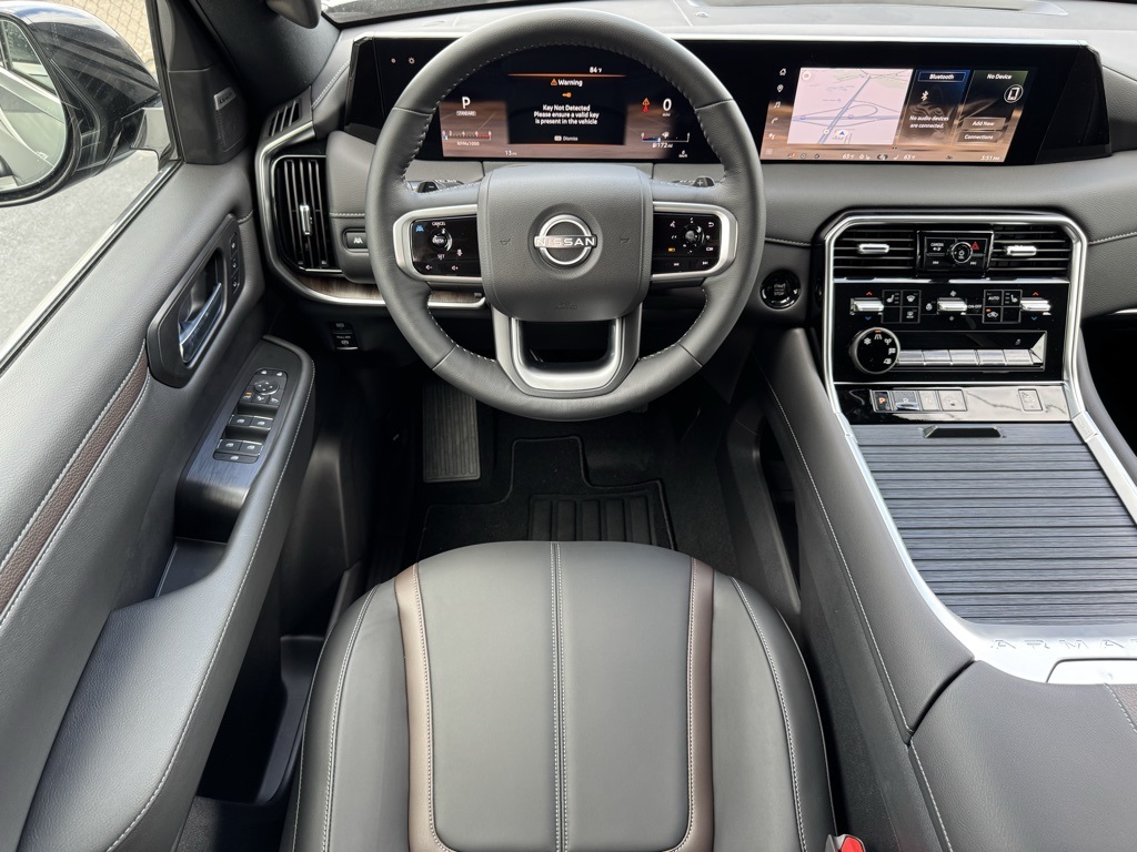12 Speakers, 3rd row seats: split-bench, 4-Wheel Disc Brakes, ABS brakes, Air Conditioning, Alloy wheels, AM/FM radio: SiriusXM w/360L, Anti-whiplash front head restraints, Apple CarPlay/Android Auto, Auto High-beam Headlights, Auto tilt-away steering wheel, Auto-dimming door mirrors, Auto-dimming Rear-View mirror, Auto-leveling suspension, Automatic temperature control, Brake assist, Bumpers: body-color, Carpeted Floor Mats with Bench Seat, Compass, Delay-off headlights, Driver door bin, Driver vanity mirror, Dual front impact airbags, Dual front side impact airbags, Electronic Stability Control, Emergency communication system: NissanConnect Services, Four wheel independent suspension, Front anti-roll bar, Front Bucket Seats, Front Center Armrest, Front dual zone A/C, Front reading lights, Fully automatic headlights, Garage door transmitter: myQ Connected Garage, Genuine wood dashboard insert, Heated door mirrors, Heated Front Bucket Seats, Heated front seats, Heated steering wheel, HVAC memory, Illuminated entry, Knee airbag, Leather steering wheel, Low tire pressure warning, Memory seat, Navigation system: Google Maps, Occupant sensing airbag, Outside temperature display, Overhead airbag, Overhead console, Panic alarm, Passenger door bin, Passenger vanity mirror, Power door mirrors, Power driver seat, Power Liftgate, Power passenger seat, Power steering, Power windows, Radio: NissanConnect with SiriusXM 360L, Rain sensing wipers, Rear air conditioning, Rear anti-roll bar, Rear reading lights, Rear seat center armrest, Rear window defroster, Rear window wiper, Reclining 3rd row seat, Remote keyless entry, Security system, Speed control, Speed-sensing steering, Speed-Sensitive Wipers, Splash Guards, Split folding rear seat, Spoiler, Steering wheel memory, Steering wheel mounted audio controls, Tachometer, TailorFit Seat Trim, Telescoping steering wheel, Tilt steering wheel, Traction control, Trip computer, Turn signal indicator mirrors, Variably intermittent wipers, Voltmeter, and Wheels: 20" x 8.5J Machined and Painted Alloy.