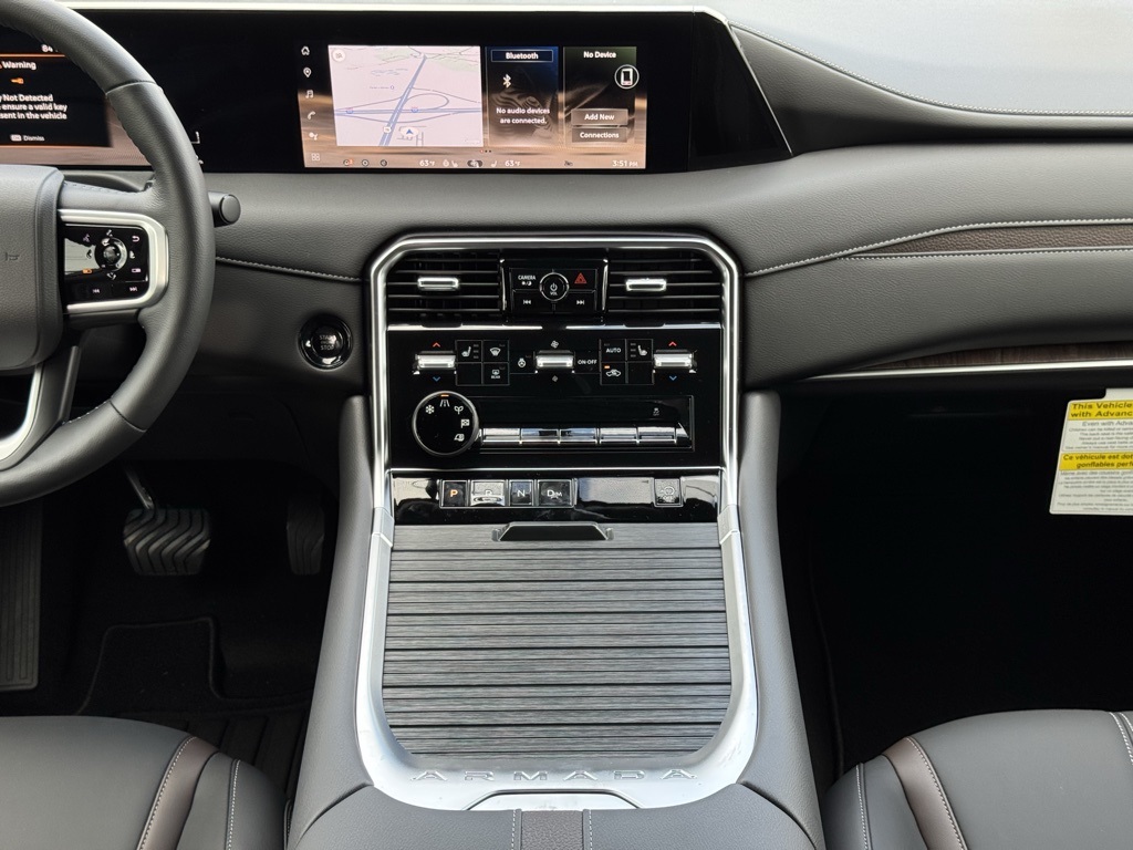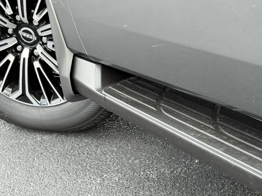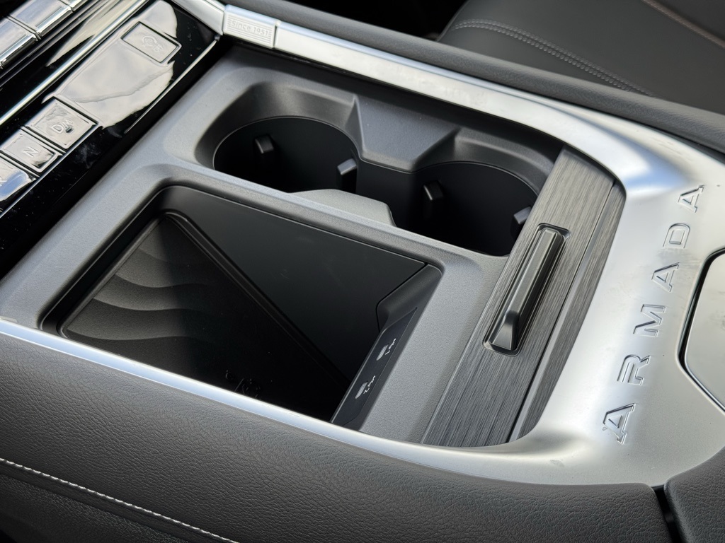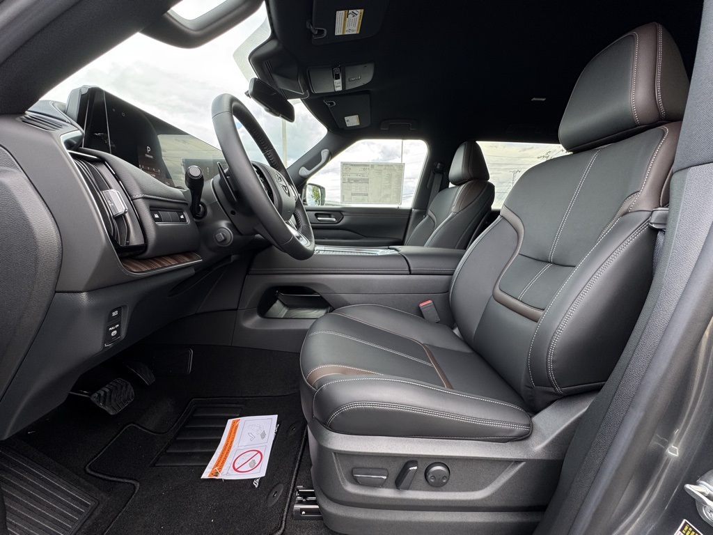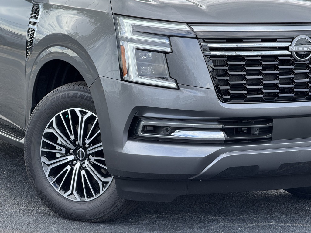 12 Speakers, 3rd row seats: split-bench, 4-Wheel Disc Brakes, ABS brakes, Air Conditioning, Alloy wheels, AM/FM radio: SiriusXM w/360L, Anti-whiplash front head restraints, Apple CarPlay/Android Auto, Auto High-beam Headlights, Auto tilt-away steering wheel, Auto-dimming door mirrors, Auto-dimming Rear-View mirror, Auto-leveling suspension, Automatic temperature control, Brake assist, Bumpers: body-color, Carpeted Floor Mats with Bench Seat, Compass, Delay-off headlights, Driver door bin, Driver vanity mirror, Dual front impact airbags, Dual front side impact airbags, Electronic Stability Control, Emergency communication system: NissanConnect Services, Four wheel independent suspension, Front anti-roll bar, Front Bucket Seats, Front Center Armrest, Front dual zone A/C, Front reading lights, Fully automatic headlights, Garage door transmitter: myQ Connected Garage, Genuine wood dashboard insert, Heated door mirrors, Heated Front Bucket Seats, Heated front seats, Heated steering wheel, HVAC memory, Illuminated entry, Knee airbag, Leather steering wheel, Low tire pressure warning, Memory seat, Navigation system: Google Maps, Occupant sensing airbag, Outside temperature display, Overhead airbag, Overhead console, Panic alarm, Passenger door bin, Passenger vanity mirror, Power door mirrors, Power driver seat, Power Liftgate, Power passenger seat, Power steering, Power windows, Radio: NissanConnect with SiriusXM 360L, Rain sensing wipers, Rear air conditioning, Rear anti-roll bar, Rear reading lights, Rear seat center armrest, Rear window defroster, Rear window wiper, Reclining 3rd row seat, Remote keyless entry, Security system, Speed control, Speed-sensing steering, Speed-Sensitive Wipers, Splash Guards, Split folding rear seat, Spoiler, Steering wheel memory, Steering wheel mounted audio controls, Tachometer, TailorFit Seat Trim, Telescoping steering wheel, Tilt steering wheel, Traction control, Trip computer, Turn signal indicator mirrors, Variably intermittent wipers, Voltmeter, and Wheels: 20" x 8.5J Machined and Painted Alloy.