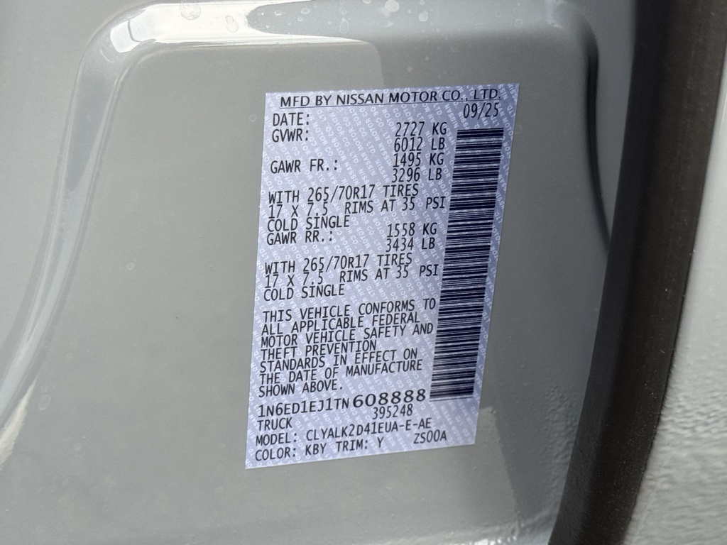 PRO Premium Package (Auto-Dimming Mirror, Auto-Tilt & Slide Sunroof w/Manual Shade, Fender Premium Audio System w/10 Speakers, HomeLink UGDO, Leather Seat Trim, Nissan Door-to-Door Navigation, Partial Under-Seat Storage Delete, and Traffic Sign Recognition (TSR)), PRO-X Convenience Package (Heated Steering Wheel, Intelligent Around View Monitor (I-AVM), and Wireless Charging for Personal Devices), Tow Package (T11), 17" Painted Alloy Wheels, 3.692 Axle Ratio, 4-Wheel Disc Brakes, 6 Speakers, ABS brakes, Air Conditioning, Alloy wheels, AM/FM radio: SiriusXM, Anti-whiplash front head restraints, Auto High-beam Headlights, Automatic temperature control, Blind Spot Warning, Brake assist, Bumpers: body-color, Carpeted Floor Mats, Delay-off headlights, Driver door bin, Driver vanity mirror, Dual front impact airbags, Dual front side impact airbags, Electronic Stability Control, Electronic Tailgate Lock, Emergency communication system, Front anti-roll bar, Front Bucket Seats, Front Center Armrest, Front dual zone A/C, Front fog lights, Front reading lights, Front wheel independent suspension, Fully automatic headlights, Heated Front Bucket Seats, Heated steering wheel, Illuminated entry, Knee airbag, Leather steering wheel, Low tire pressure warning, Mud Flaps, Occupant sensing airbag, Off-Road Style Step Rails, Overhead airbag, Overhead console, Panic alarm, Passenger door bin, Passenger vanity mirror, Power door mirrors, Power driver seat, Power passenger seat, Power steering, Power windows, Premium Paint, PRO Embroidered Premium Cloth Seat Trim, Radio data system, Radio: SXM/AM/FM/AUX/USB Audio System, Rear anti-roll bar, Rear seat center armrest, Rear side impact airbag, Rear step bumper, Remote keyless entry, Security system, Speed control, Speed-sensing steering, Split folding rear seat, Steering wheel mounted audio controls, Tachometer, Telescoping steering wheel, Tilt steering wheel, Traction control, Trip computer, Variably intermittent wipers, Voltmeter, and Wireless Apple CarPlay/Wireless Android Auto. Price includes all rebates: $2500 - Nissan Customer Cash. Exp. 01/05/2026