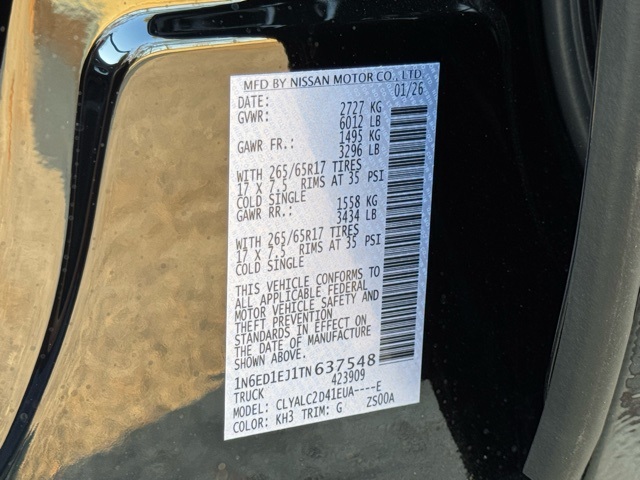 SV Convenience Package (120V Power Outlet in Bed, 120V Power Outlet in Rear Center Console, Bed Under-Rail Lighting, Heated Front Seats, Heated Leather Steering Wheel, Heated Outside Mirrors, HVAC - Dual-Zone Front Auto A/C, I-Key w/Request Switches on O/S Handles, Locking Glove Box, Remote Engine Starter, Spray-In Bedliner, Tow/Haul Mode Switch, Trailer Hitch w/Wiring Harness, and Utili-Track System), Tow Package (T11), 17" Alloy Wheels, 3.692 Axle Ratio, 4-Wheel Disc Brakes, 6 Speakers, ABS brakes, Air Conditioning, Alloy wheels, AM/FM radio: SiriusXM, Anti-whiplash front head restraints, Auto High-beam Headlights, Blind Spot Warning, Brake assist, Bumpers: body-color, Carpeted Floor Mats, Delay-off headlights, Driver door bin, Driver vanity mirror, Dual front impact airbags, Dual front side impact airbags, Electronic Stability Control, Electronic Tailgate Lock, Emergency communication system, Front anti-roll bar, Front Bucket Seats, Front Center Armrest, Front reading lights, Front wheel independent suspension, Fully automatic headlights, Illuminated entry, Knee airbag, Low tire pressure warning, Occupant sensing airbag, Overhead airbag, Overhead console, Panic alarm, Passenger door bin, Passenger vanity mirror, Power door mirrors, Power driver seat, Power steering, Power windows, Premium Cloth Seat Trim, Radio data system, Radio: SXM/AM/FM/AUX/USB Audio System, Rear anti-roll bar, Rear seat center armrest, Rear side impact airbag, Rear step bumper, Remote keyless entry, Security system, Speed control, Speed-sensing steering, Splash Guards, Split folding rear seat, Steering wheel mounted audio controls, Tachometer, Telescoping steering wheel, Tilt steering wheel, Traction control, Trip computer, Variably intermittent wipers, Voltmeter, and Wireless Apple CarPlay/Wireless Android Auto. Price includes: $2500 - Nissan Customer Cash. Exp. 03/31/2026 Price includes dealer added accessories.