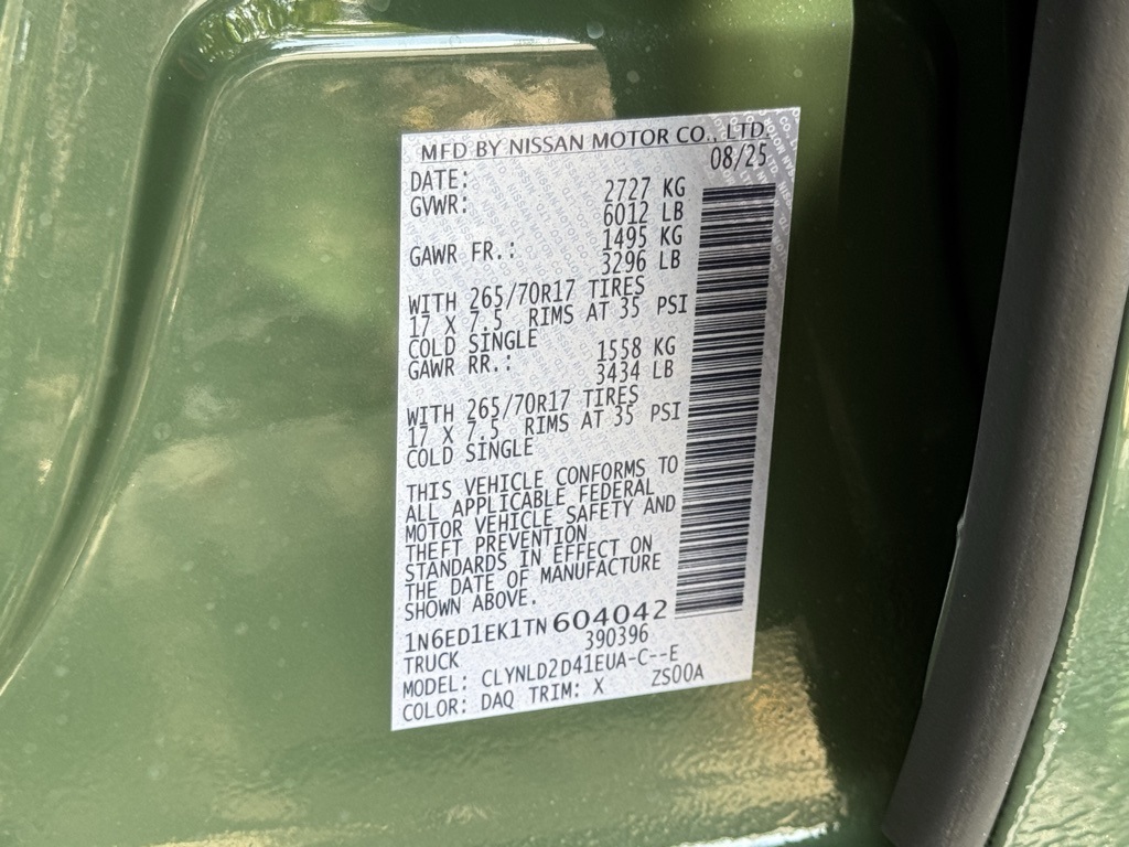 PRO-4X Convenience Package, 4WD, 17" Painted Alloy Wheels, 3.692 Axle Ratio, 4-Wheel Disc Brakes, 6 Speakers, ABS brakes, Air Conditioning, Alloy wheels, AM/FM radio: SiriusXM, Anti-whiplash front head restraints, Auto High-beam Headlights, Automatic temperature control, Blind Spot Warning, Brake assist, Bumpers: body-color, Delay-off headlights, Driver door bin, Driver vanity mirror, Dual front impact airbags, Dual front side impact airbags, Electronic Stability Control, Electronic Tailgate Lock, Emergency communication system, Essentials Kit, Front anti-roll bar, Front Bucket Seats, Front Center Armrest, Front dual zone A/C, Front fog lights, Front reading lights, Front wheel independent suspension, Fully automatic headlights, Heated Front Bucket Seats, Heated front seats, Heated steering wheel, Illuminated entry, Knee airbag, Leather steering wheel, Low tire pressure warning, Mud Flaps, Occupant sensing airbag, Off-Road Style Step Rails, Overhead airbag, Overhead console, Panic alarm, Passenger door bin, Passenger vanity mirror, Power door mirrors, Power driver seat, Power passenger seat, Power steering, Power windows, Premium Paint, PRO Embroidered Premium Cloth Seat Trim, Radio data system, Radio: SXM/AM/FM/AUX/USB Audio System, Rear anti-roll bar, Rear seat center armrest, Rear side impact airbag, Rear step bumper, Remote keyless entry, Security system, Speed control, Speed-sensing steering, Split folding rear seat, Steering wheel mounted audio controls, Tachometer, Telescoping steering wheel, Tilt steering wheel, Traction control, Trip computer, Variably intermittent wipers, Voltmeter, and Wireless Apple CarPlay/Wireless Android Auto. Price includes all rebates: $2500 - Nissan Customer Cash. Exp. 01/05/2026