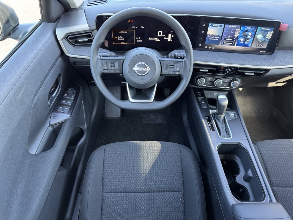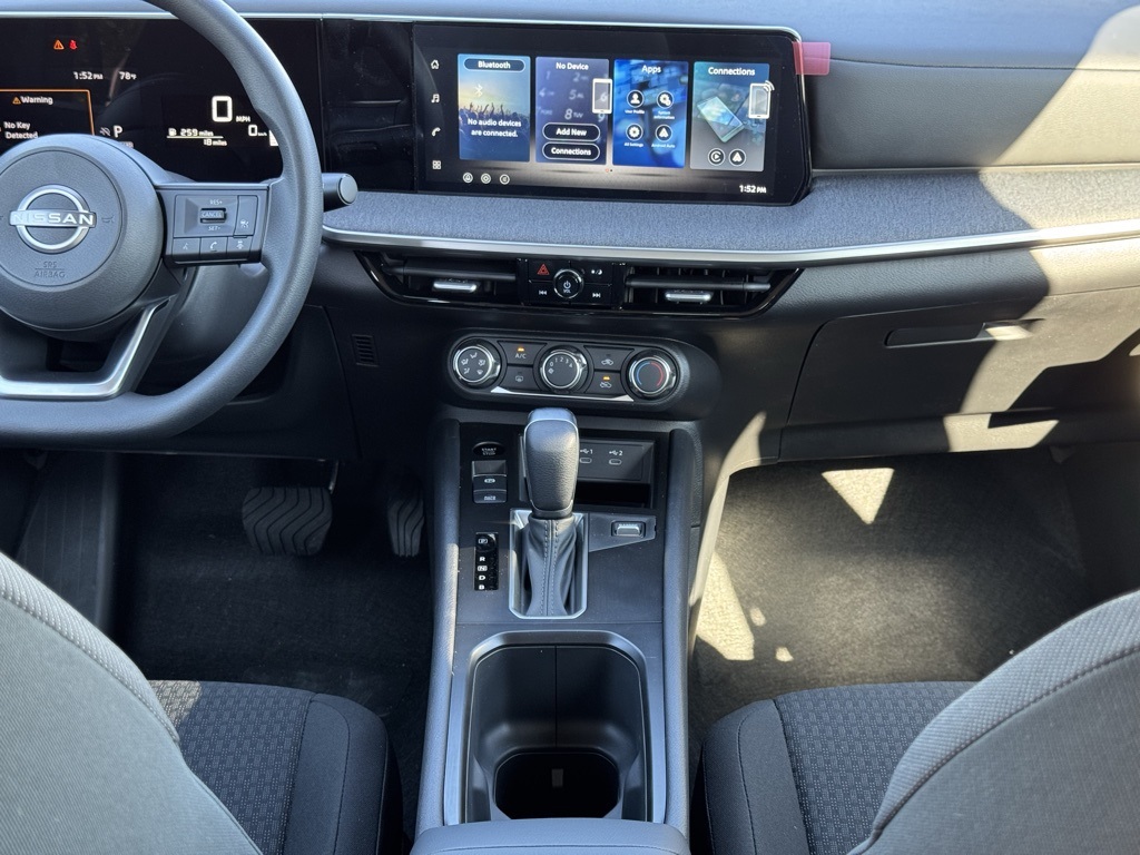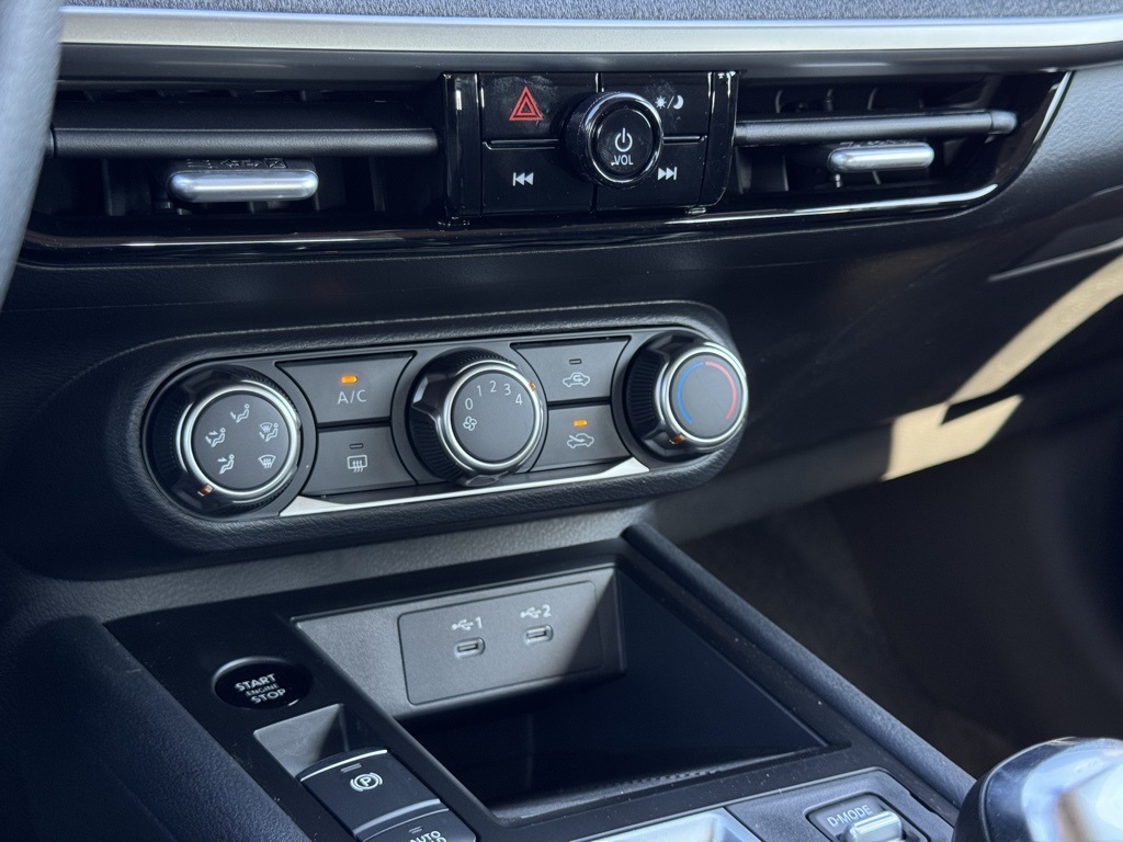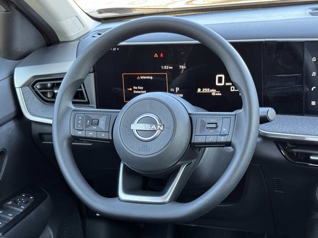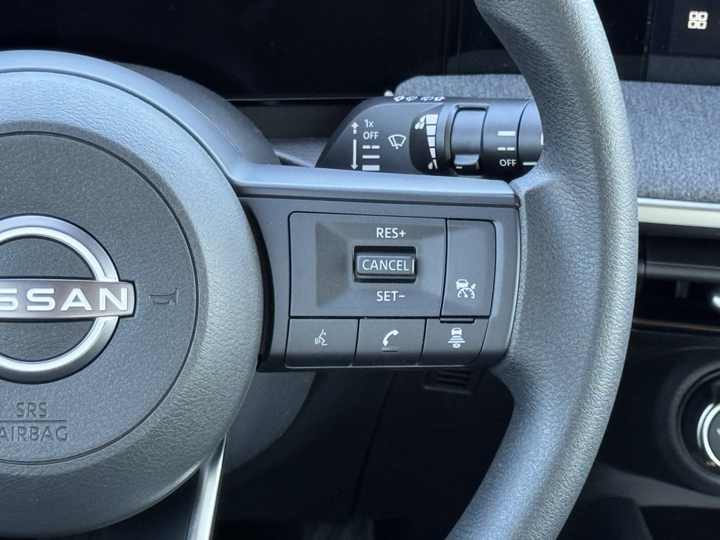 16" Steel Wheels w/Full Covers, 4 Speakers, 4-Wheel Disc Brakes, ABS brakes, Air Conditioning, AM/FM radio, Auto High-beam Headlights, Blind Spot Warning, Brake assist, Bumpers: body-color, Carpeted Floor Mats & Cargo Mat, Cloth Seat Trim, Driver door bin, Driver vanity mirror, Driver's Seat Mounted Armrest, Dual front impact airbags, Dual front side impact airbags, Electronic Stability Control, Emergency communication system, Exterior Parking Camera Rear, Front anti-roll bar, Front Bucket Seats, Front reading lights, Front wheel independent suspension, Fully automatic headlights, Illuminated entry, Knee airbag, Low tire pressure warning, NissanConnect featuring Apple CarPlay and Android Auto, Occupant sensing airbag, Outside temperature display, Overhead airbag, Panic alarm, Passenger door bin, Passenger vanity mirror, Power door mirrors, Power steering, Power windows, Radio data system, Radio: AM/FM/SiriusXM Audio System, Rear anti-roll bar, Rear reading lights, Rear side impact airbag, Rear window defroster, Rear window wiper, Remote keyless entry, Security system, Speed control, Speed-sensing steering, Splash Guards, Split folding rear seat, Spoiler, Sport steering wheel, Steering wheel mounted audio controls, Tachometer, Telescoping steering wheel, Tilt steering wheel, Traction control, Trip computer, and Variably intermittent wipers.