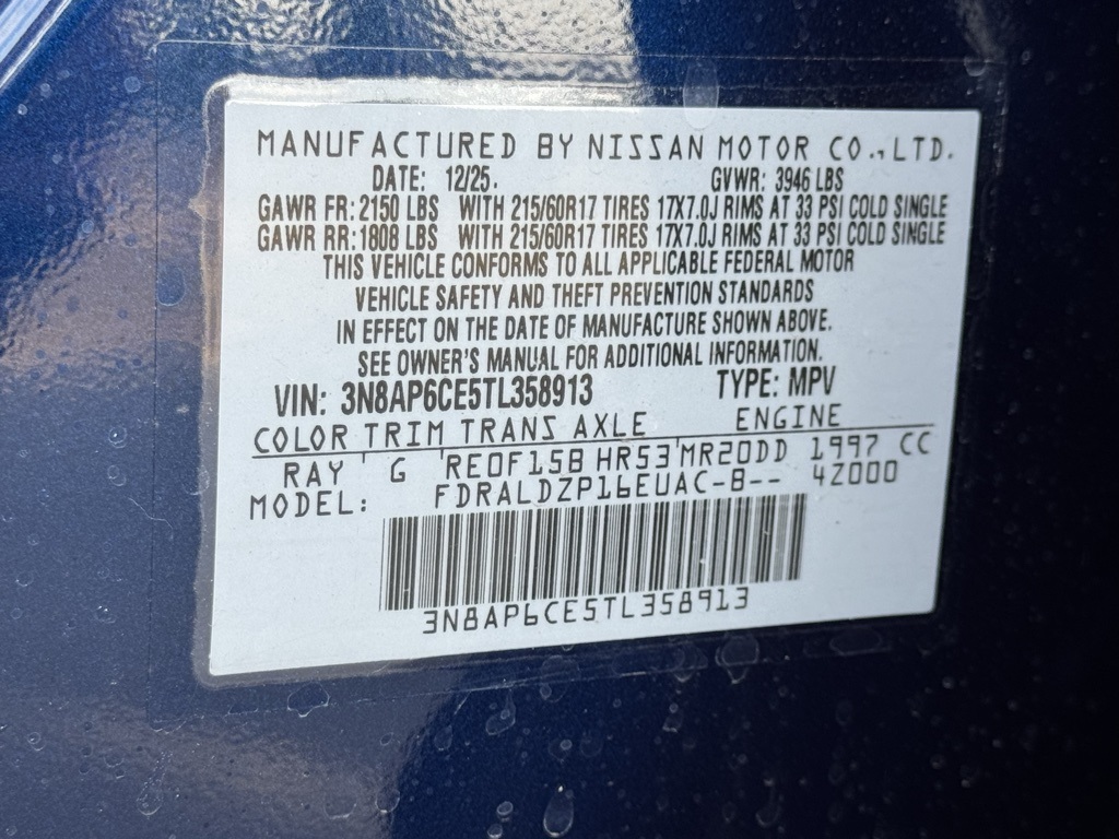 Cold Weather Package (Heated Front Seats, Heated Mirrors, and Rear Floor Heater Ducts), SV Premium Package (Illuminated Driver & Passenger Sun Visors, Panoramic Moonroof, and Sunglass Holder), 4 Speakers, 4-Wheel Disc Brakes, ABS brakes, Air Conditioning, AM/FM radio, Auto High-beam Headlights, Automatic temperature control, Blind Spot Warning, Brake assist, Bumpers: body-color, Carpeted Floor Mats & Underfloor Protector, Cloth Seat Trim, Driver door bin, Driver vanity mirror, Dual front impact airbags, Dual front side impact airbags, Electronic Stability Control, Emergency communication system, Exterior Parking Camera Rear, Front anti-roll bar, Front Bucket Seats, Front Center Armrest, Front reading lights, Front wheel independent suspension, Fully automatic headlights, Illuminated entry, Knee airbag, Low tire pressure warning, NissanConnect featuring Apple CarPlay and Android Auto, Occupant sensing airbag, Outside temperature display, Overhead airbag, Panic alarm, Passenger door bin, Passenger vanity mirror, Power door mirrors, Power steering, Power windows, Radio data system, Radio: AM/FM/SiriusXM Audio System, Rear anti-roll bar, Rear reading lights, Rear side impact airbag, Rear window defroster, Rear window wiper, Remote keyless entry, Security system, Speed control, Speed-sensing steering, Splash Guards, Split folding rear seat, Spoiler, Sport steering wheel, Steering wheel mounted audio controls, Tachometer, Telescoping steering wheel, Tilt steering wheel, Traction control, Trip computer, Variably intermittent wipers, and Wheels: 17" Steel Flex w/Full Covers. Price includes all rebates: $1000 - Nissan Customer Cash. Exp. 02/02/2026