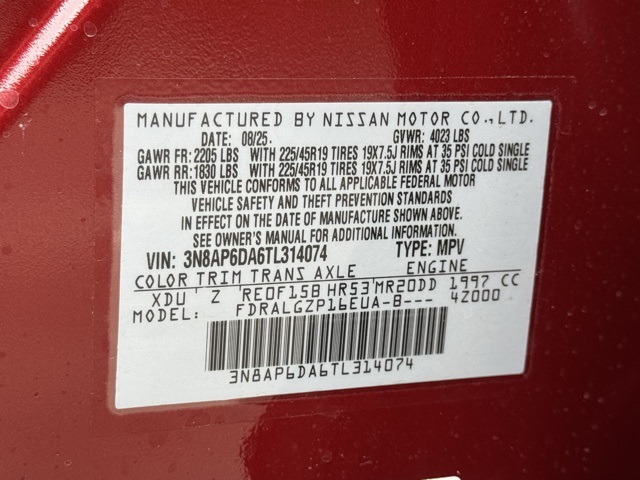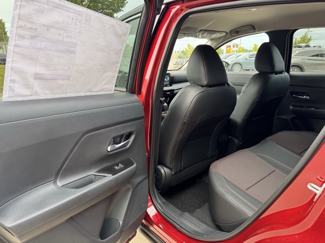 17" Alloy Wheels, 19" Alloy Wheels, 2-Tone Premium Paint, 4-Wheel Disc Brakes, 6 Speakers, ABS brakes, Air Conditioning, Alloy wheels, AM/FM radio, Auto High-beam Headlights, Automatic temperature control, Brake assist, Bumpers: body-color, Carpeted Floor Mats & Underfloor Protector, Crossbars, Delay-off headlights, Driver door bin, Driver vanity mirror, Dual front impact airbags, Dual front side impact airbags, Electronic Stability Control, Emergency communication system: NissanConnect Services, Exterior Parking Camera Rear, Front anti-roll bar, Front Bucket Seats, Front Center Armrest, Front reading lights, Front wheel independent suspension, Fully automatic headlights, Garage door transmitter: myQ Connected Garage, Illuminated entry, Knee airbag, Leather Shift Knob, Leather steering wheel, Low tire pressure warning, NissanConnect featuring Apple CarPlay and Android Auto, Occupant sensing airbag, Outside temperature display, Overhead airbag, Overhead console, Panic alarm, Passenger door bin, Passenger vanity mirror, Power door mirrors, Power steering, Power windows, Radio data system, Radio: AM/FM/SiriusXM Audio System, Rear anti-roll bar, Rear reading lights, Rear seat center armrest, Rear side impact airbag, Rear window defroster, Rear window wiper, Remote keyless entry, Security system, Speed control, Speed-sensing steering, Splash Guards, Split folding rear seat, Spoiler, Sport Leatherette w/Cloth Insert Seat Trim, Sport steering wheel, Steering wheel mounted audio controls, Tachometer, Telescoping steering wheel, Tilt steering wheel, Traction control, Trip computer, Turn signal indicator mirrors, and Variably intermittent wipers.