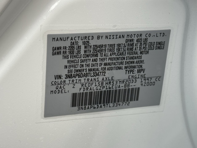 Cold Weather Package (Heated Front Seats, Heated Mirrors, and Rear Floor Heater Ducts), 17" Alloy Wheels, 19" Alloy Wheels, 4-Wheel Disc Brakes, 6 Speakers, ABS brakes, Air Conditioning, Alloy wheels, AM/FM radio, Auto High-beam Headlights, Automatic temperature control, Brake assist, Bumpers: body-color, Carpeted Floor Mats & Underfloor Protector, Crossbars, Delay-off headlights, Driver door bin, Driver vanity mirror, Dual front impact airbags, Dual front side impact airbags, Electronic Stability Control, Emergency communication system: NissanConnect Services, Exterior Parking Camera Rear, Front anti-roll bar, Front Bucket Seats, Front Center Armrest, Front reading lights, Front wheel independent suspension, Fully automatic headlights, Garage door transmitter: myQ Connected Garage, Illuminated entry, Knee airbag, Leather Shift Knob, Leather steering wheel, Low tire pressure warning, NissanConnect featuring Apple CarPlay and Android Auto, Occupant sensing airbag, Outside temperature display, Overhead airbag, Overhead console, Panic alarm, Passenger door bin, Passenger vanity mirror, Power door mirrors, Power steering, Power windows, Premium Paint, Radio data system, Radio: AM/FM/SiriusXM Audio System, Rear anti-roll bar, Rear reading lights, Rear seat center armrest, Rear side impact airbag, Rear window defroster, Rear window wiper, Remote keyless entry, Security system, Speed control, Speed-sensing steering, Splash Guards, Split folding rear seat, Spoiler, Sport Leatherette w/Cloth Insert Seat Trim, Sport steering wheel, Steering wheel mounted audio controls, Tachometer, Telescoping steering wheel, Tilt steering wheel, Traction control, Trip computer, Turn signal indicator mirrors, and Variably intermittent wipers.
