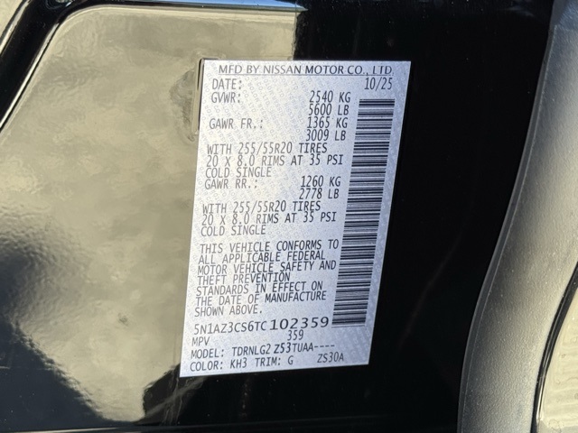 Comfort Package (Heated & Ventilated Front Bucket Seats w/Massage, Heated Rear Seats, and Motion-Activated Power Liftgate), 10 Speakers, 20" Alloy Wheels, 4-Wheel Disc Brakes, ABS brakes, Air Conditioning, Alloy wheels, AM/FM radio: SiriusXM w/360L, Auto High-beam Headlights, Auto-dimming Rear-View mirror, Automatic temperature control, Brake assist, Bumpers: body-color, Carpeted Floor & Cargo Mats, Child-Seat-Sensing Airbag, Compass, Delay-off headlights, Driver door bin, Driver vanity mirror, Dual front impact airbags, Dual front side impact airbags, Electronic Stability Control, Emergency communication system: NissanConnect Services, Four wheel independent suspension, Frameless Rearview Mirror w/UGDO, Front anti-roll bar, Front Bucket Seats, Front Center Armrest, Front dual zone A/C, Front reading lights, Fully automatic headlights, Garage door transmitter: myQ Connected Garage, Grained Splash Guards, Heated door mirrors, Heated Front Bucket Seats, Heated front seats, Heated steering wheel, Illuminated entry, Knee airbag, Low tire pressure warning, Memory seat, Navigation system: NissanConnect with Navigation and Services, Occupant sensing airbag, Outside temperature display, Overhead airbag, Overhead console, Panic alarm, Passenger door bin, Passenger vanity mirror, Power door mirrors, Power driver seat, Power Liftgate, Power moonroof: Panoramic, Power passenger seat, Power steering, Power windows, Prima-Tex Leatherette Seat Trim w/Perforation, Radio data system, Radio: NissanConnect w/Hybrid Radio, Rear anti-roll bar, Rear reading lights, Rear seat center armrest, Rear side impact airbag, Rear window defroster, Rear window wiper, Remote keyless entry, Security system, Speed control, Speed-Sensitive Wipers, Split folding rear seat, Spoiler, Steering wheel mounted audio controls, Tachometer, Telescoping steering wheel, Tilt steering wheel, Traction control, Trip computer, Turn signal indicator mirrors, Variably intermittent wipers, and Wireless Apple CarPlay/Wireless Android Auto.