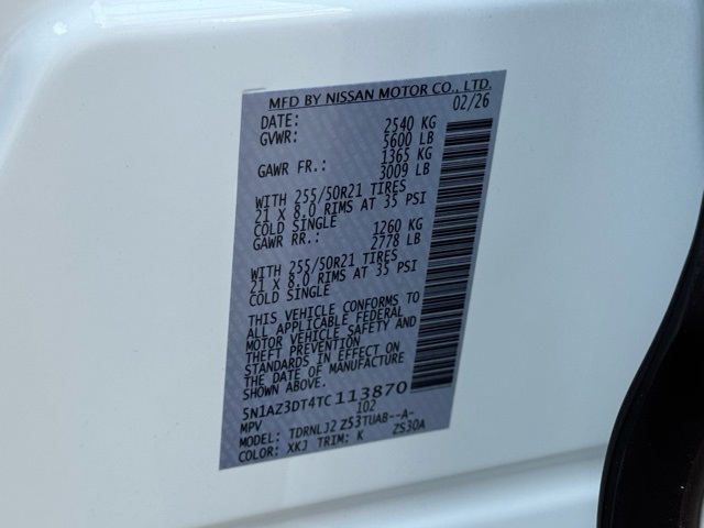 Cargo Package (3-Position Cargo Area Protector, Cargo Net, First Aid Kit, and Retractable Cargo Cover), Technology Package (3D Around View Monitor, Driver Attention Warning, Driver Distraction Warning, and ProPILOT Assist 2.1), 10 Speakers, 2-Tone w/Premium Paint, 21" Alloy Wheels, 4-Wheel Disc Brakes, ABS brakes, Air Conditioning, Alloy wheels, AM/FM radio: SiriusXM w/360L, Auto High-beam Headlights, Auto tilt-away steering wheel, Auto-dimming Rear-View mirror, Automatic temperature control, Brake assist, Bumpers: body-color, Carpeted Floor & Cargo Mats, Child-Seat-Sensing Airbag, Compass, Delay-off headlights, Driver door bin, Driver vanity mirror, Dual front impact airbags, Dual front side impact airbags, Electronic Stability Control, Emergency communication system: NissanConnect Services, Four wheel independent suspension, Front anti-roll bar, Front Bucket Seats, Front Center Armrest, Front dual zone A/C, Front reading lights, Fully automatic headlights, Garage door transmitter: HomeLink, Heads-Up Display, Heated & Ventilated Front Bucket Seats w/Massage, Heated door mirrors, Heated front seats, Heated rear seats, Heated steering wheel, Illuminated entry, Illuminated Kick Plates, Knee airbag, Low tire pressure warning, Memory seat, Navigation system: NissanConnect with Navigation and Services, Occupant sensing airbag, Outside temperature display, Overhead airbag, Overhead console, Painted Splash Guards, Panic alarm, Passenger door bin, Passenger vanity mirror, Power door mirrors, Power driver seat, Power Liftgate, Power moonroof: Panoramic, Power passenger seat, Power steering, Power windows, Quilted Semi-Aniline Leather-Appointed Seat Trim, Radio data system, Radio: NissanConnect w/Hybrid Radio, Rain sensing wipers, Rear anti-roll bar, Rear reading lights, Rear seat center armrest, Rear side impact airbag, Rear window defroster, Rear window wiper, Remote keyless entry, Security system, Speed control, Speed-Sensitive Wipers, Split folding rear seat, Spoiler, Steering wheel memory, Steering wheel mounted audio controls, Tachometer, Telescoping steering wheel, Tilt steering wheel, Traction control, Trip computer, Turn signal indicator mirrors, USB Charging Cables, Variably intermittent wipers, Ventilated front seats, and Wireless Apple CarPlay/Wireless Android Auto. Price includes: $4000 - Nissan Customer Cash. Exp. 03/31/2026 Price includes dealer added accessories.