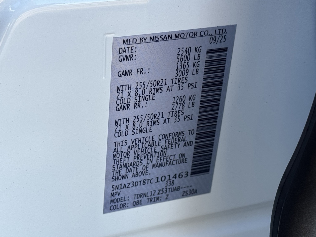 Cargo Package (3-Position Cargo Area Protector, Cargo Net, First Aid Kit, and Retractable Cargo Cover), Technology Package (3D Around View Monitor, Driver Attention Warning, Driver Distraction Warning, and ProPILOT Assist 2.1), 9-Speed Automatic, AWD, 10 Speakers, 21" Alloy Wheels, 4-Wheel Disc Brakes, ABS brakes, Air Conditioning, Alloy wheels, AM/FM radio: SiriusXM w/360L, Auto High-beam Headlights, Auto tilt-away steering wheel, Auto-dimming Rear-View mirror, Automatic temperature control, Brake assist, Bumpers: body-color, Carpeted Floor & Cargo Mats, Child-Seat-Sensing Airbag, Compass, Delay-off headlights, Driver door bin, Driver vanity mirror, Dual front impact airbags, Dual front side impact airbags, Electronic Stability Control, Emergency communication system: NissanConnect Services, Four wheel independent suspension, Front anti-roll bar, Front Bucket Seats, Front Center Armrest, Front dual zone A/C, Front reading lights, Fully automatic headlights, Garage door transmitter: HomeLink, Heads-Up Display, Heated & Ventilated Front Bucket Seats w/Massage, Heated door mirrors, Heated front seats, Heated rear seats, Heated steering wheel, Illuminated entry, Illuminated Kick Plates, Knee airbag, Low tire pressure warning, Memory seat, Navigation system: NissanConnect with Navigation and Services, Occupant sensing airbag, Outside temperature display, Overhead airbag, Overhead console, Painted Splash Guards, Panic alarm, Passenger door bin, Passenger vanity mirror, Power door mirrors, Power driver seat, Power Liftgate, Power moonroof: Panoramic, Power passenger seat, Power steering, Power windows, Premium Paint, Quilted Semi-Aniline Leather-Appointed Seat Trim, Radio data system, Radio: NissanConnect w/Hybrid Radio, Rain sensing wipers, Rear anti-roll bar, Rear reading lights, Rear seat center armrest, Rear side impact airbag, Rear window defroster, Rear window wiper, Remote keyless entry, Security system, Speed control, Speed-Sensitive Wipers, Split folding rear seat, Spoiler, Steering wheel memory, Steering wheel mounted audio controls, Tachometer, Telescoping steering wheel, Tilt steering wheel, Traction control, Trip computer, Turn signal indicator mirrors, Variably intermittent wipers, Ventilated front seats, and Wireless Apple CarPlay/Wireless Android Auto. Price includes all rebates: $2000 - Nissan Customer Cash. Exp. 12/01/2025