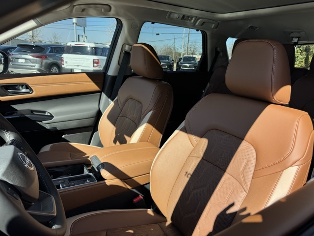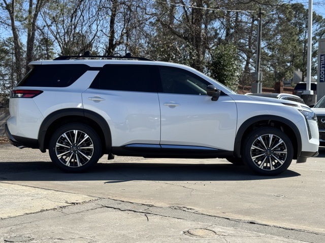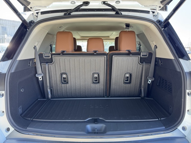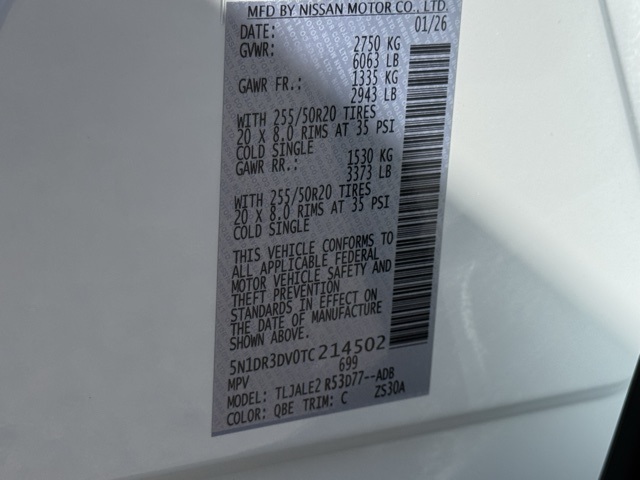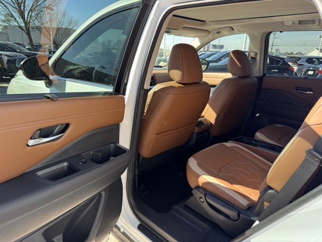 Cargo Package (Cargo Area Protector, Cargo Net, and First Aid), Platinum Captain Chairs Package (2nd-Row Captain Chairs and 2nd-Row Removable Centre Console), 13 Speakers, 3rd row seats: bench, 4-Piece Black Splash Guards, 4-Wheel Disc Brakes, ABS brakes, Air Conditioning, Alloy wheels, AM/FM radio: SiriusXM w/360L, Auto High-beam Headlights, Auto tilt-away steering wheel, Auto-dimming Rear-View mirror, Automatic temperature control, Bodyside moldings, Bose Premium Audio System, Brake assist, Bumpers: body-color, Captain's Chairs Carpeted Floor Mats, Climate Controlled Front Bucket Seats, Cross Bars, Delay-off headlights, Driver door bin, Driver vanity mirror, Dual front impact airbags, Dual front side impact airbags, Electronic Stability Control, Emergency communication system: NissanConnect Services, Four wheel independent suspension, Front anti-roll bar, Front Bucket Seats, Front Center Armrest, Front dual zone A/C, Front reading lights, Fully automatic headlights, Garage door transmitter: HomeLink, Heads-Up Display, Heated door mirrors, Heated front seats, Heated rear seats, Heated steering wheel, Illuminated entry, Knee airbag, Low tire pressure warning, Memory seat, NissanConnect featuring Apple CarPlay and Android Auto, Occupant sensing airbag, Outside temperature display, Overhead airbag, Overhead console, Panic alarm, Passenger door bin, Passenger vanity mirror, Power door mirrors, Power driver seat, Power Liftgate, Power moonroof, Power passenger seat, Power steering, Power windows, Premium Paint, Radio data system, Radio: AM/FM Audio System with NissanConnect, Rain sensing wipers, Rear air conditioning, Rear anti-roll bar, Rear reading lights, Rear seat center armrest, Rear side impact airbag, Rear window defroster, Rear window wiper, Reclining 3rd row seat, Remote keyless entry, Security system, Semi-Aniline Leather-Appointed Seating Surfaces, Speed control, Speed-sensing steering, Speed-Sensitive Wipers, Split folding rear seat, Spoiler, Steering wheel memory, Steering wheel mounted audio controls, Tachometer, Telescoping steering wheel, Tilt steering wheel, Traction control, Trip computer, Turn signal indicator mirrors, Variably intermittent wipers, Ventilated front seats, and Wheels: 20" Machined Alloy. Price includes: $2000 - Nissan Customer Cash. Exp. 03/31/2026 Price includes dealer added accessories.