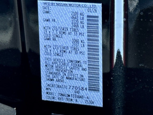 4-Wheel Disc Brakes, 6 Speakers, ABS brakes, Air Conditioning, Alloy wheels, AM/FM radio, Apple CarPlay/Android Auto, Auto High-beam Headlights, Automatic temperature control, Black Splash Guards (set of 4), Brake assist, Bumpers: body-color, Delay-off headlights, Driver door bin, Driver vanity mirror, Dual front impact airbags, Dual front side impact airbags, Electronic Stability Control, Emergency communication system: NissanConnect Services, Exterior Parking Camera Rear, First Aid Kit, Floor Mats with 1-Piece Cargo Area Protector, Four wheel independent suspension, Frameless Rearview Mirror with Universal Remote, Front anti-roll bar, Front Bucket Seats, Front Center Armrest, Front dual zone A/C, Front reading lights, Fully automatic headlights, Heated door mirrors, Heated Front Bucket Seats, Heated front seats, Heated steering wheel, Illuminated entry, Illuminated Kick Plates, Knee airbag, Low tire pressure warning, Occupant sensing airbag, Outside temperature display, Overhead airbag, Overhead console, Panic alarm, Passenger door bin, Passenger vanity mirror, Power door mirrors, Power driver seat, Power Liftgate, Power moonroof, Power steering, Power windows, Prima-Tex Leatherette Seat Trim, Radio data system, Radio: AM/FM NissanConnect, Rear anti-roll bar, Rear Parking Sensors, Rear reading lights, Rear seat center armrest, Rear side impact airbag, Rear window defroster, Rear window wiper, Remote keyless entry, Retractable Cargo Cover, Speed control, Speed-sensing steering, Speed-Sensitive Wipers, Split folding rear seat, Spoiler, Steering wheel mounted audio controls, Tachometer, Telescoping steering wheel, Tilt steering wheel, Traction control, Trip computer, USB Charging Cable Set, Variably intermittent wipers, and Wheels: 19" Black Painted and Machine Finished Alloy. Price includes: $3500 - Nissan Customer Cash. Exp. 03/31/2026 Price includes dealer added accessories.