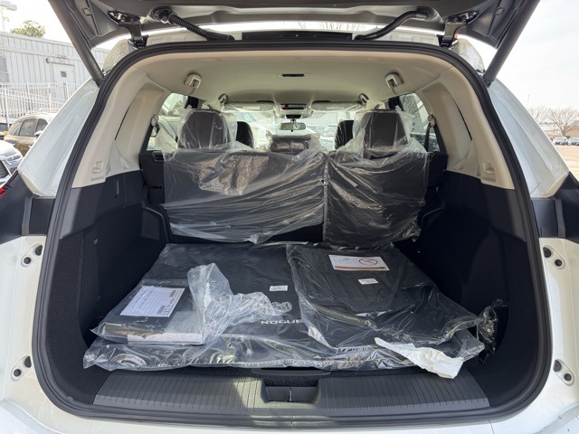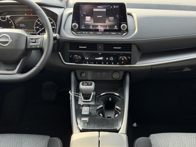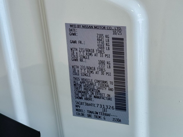 Cold Weather Package (Heated Front Seats and Heated Steering Wheel), 4-Wheel Disc Brakes, 6 Speakers, ABS brakes, Air Conditioning, Alloy wheels, AM/FM radio: Sirius, Apple CarPlay/Android Auto, Auto High-beam Headlights, Automatic temperature control, Black Splash Guards (Set of 4) (B92), Brake assist, Bumpers: body-color, Chrome Rear Bumper Protector, Cloth Seat Trim w/Patterned Inserts, Delay-off headlights, Driver door bin, Driver vanity mirror, Dual front impact airbags, Dual front side impact airbags, Electronic Stability Control, Emergency communication system: NissanConnect Services, First Aid Kit, Floor Mats w/1-Piece Cargo Area Protector, Four wheel independent suspension, Front anti-roll bar, Front Bucket Seats, Front Center Armrest, Front dual zone A/C, Front reading lights, Fully automatic headlights, Heated door mirrors, Illuminated entry, Knee airbag, Low tire pressure warning, Occupant sensing airbag, Outside temperature display, Overhead airbag, Overhead console, Panic alarm, Passenger door bin, Passenger vanity mirror, Power door mirrors, Power driver seat, Power Liftgate, Power steering, Power windows, Premium Paint, Radio data system, Radio: AM/FM NissanConnect, Rear anti-roll bar, Rear seat center armrest, Rear side impact airbag, Rear window defroster, Rear window wiper, Remote keyless entry, Speed control, Speed-sensing steering, Speed-Sensitive Wipers, Split folding rear seat, Spoiler, Steering wheel mounted audio controls, Tachometer, Telescoping steering wheel, Tilt steering wheel, Traction control, Trip computer, Variably intermittent wipers, and Wheels: 18" Dark Painted Machine Finished Alloy.