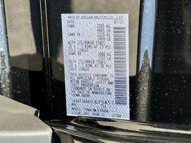4-Wheel Disc Brakes, 6 Speakers, ABS brakes, Air Conditioning, Alloy wheels, AM/FM radio: Sirius, Apple CarPlay/Android Auto, Auto High-beam Headlights, Automatic temperature control, Black Splash Guards (Set of 4) (B92), Brake assist, Bumpers: body-color, Chrome Rear Bumper Protector, Cloth Seat Trim w/Patterned Inserts, Delay-off headlights, Driver door bin, Driver vanity mirror, Dual front impact airbags, Dual front side impact airbags, Electronic Stability Control, Emergency communication system: NissanConnect Services, First Aid Kit, Floor Mats w/1-Piece Cargo Area Protector, Four wheel independent suspension, Front anti-roll bar, Front Bucket Seats, Front Center Armrest, Front dual zone A/C, Front reading lights, Fully automatic headlights, Heated door mirrors, Illuminated entry, Knee airbag, Low tire pressure warning, Occupant sensing airbag, Outside temperature display, Overhead airbag, Overhead console, Panic alarm, Passenger door bin, Passenger vanity mirror, Power door mirrors, Power driver seat, Power Liftgate, Power steering, Power windows, Radio data system, Radio: AM/FM NissanConnect, Rear anti-roll bar, Rear seat center armrest, Rear side impact airbag, Rear window defroster, Rear window wiper, Remote keyless entry, Speed control, Speed-sensing steering, Speed-Sensitive Wipers, Split folding rear seat, Spoiler, Steering wheel mounted audio controls, Tachometer, Telescoping steering wheel, Tilt steering wheel, Traction control, Trip computer, Variably intermittent wipers, and Wheels: 18" Dark Painted Machine Finished Alloy. Price includes dealer added accessories.