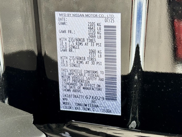 4-Wheel Disc Brakes, 6 Speakers, ABS brakes, Air Conditioning, Alloy wheels, AM/FM radio: Sirius, Apple CarPlay/Android Auto, Auto High-beam Headlights, Automatic temperature control, Black Splash Guards (Set of 4) (B92), Brake assist, Bumpers: body-color, Chrome Rear Bumper Protector, Cloth Seat Trim w/Patterned Inserts, Delay-off headlights, Driver door bin, Driver vanity mirror, Dual front impact airbags, Dual front side impact airbags, Electronic Stability Control, Emergency communication system: NissanConnect Services, First Aid Kit, Floor Mats w/1-Piece Cargo Area Protector, Four wheel independent suspension, Front anti-roll bar, Front Bucket Seats, Front Center Armrest, Front dual zone A/C, Front reading lights, Fully automatic headlights, Heated door mirrors, Illuminated entry, Knee airbag, Low tire pressure warning, Occupant sensing airbag, Outside temperature display, Overhead airbag, Overhead console, Panic alarm, Passenger door bin, Passenger vanity mirror, Power door mirrors, Power driver seat, Power Liftgate, Power steering, Power windows, Radio data system, Radio: AM/FM NissanConnect, Rear anti-roll bar, Rear seat center armrest, Rear side impact airbag, Rear window defroster, Rear window wiper, Remote keyless entry, Speed control, Speed-sensing steering, Speed-Sensitive Wipers, Split folding rear seat, Spoiler, Steering wheel mounted audio controls, Tachometer, Telescoping steering wheel, Tilt steering wheel, Traction control, Trip computer, Variably intermittent wipers, and Wheels: 18" Dark Painted Machine Finished Alloy. Price includes dealer added accessories.