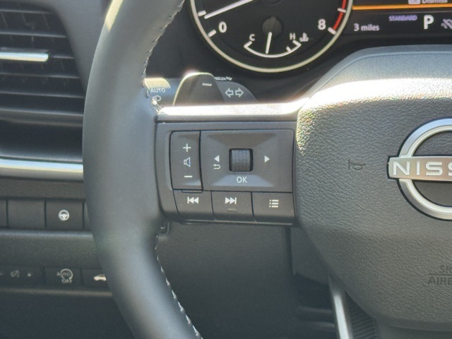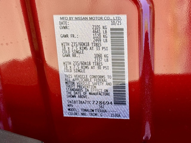 4-Wheel Disc Brakes, 6 Speakers, ABS brakes, Air Conditioning, Alloy wheels, AM/FM radio: Sirius, Apple CarPlay/Android Auto, Auto High-beam Headlights, Automatic temperature control, Black Splash Guards (Set of 4) (B92), Brake assist, Bumpers: body-color, Chrome Rear Bumper Protector, Cloth Seat Trim w/Patterned Inserts, Delay-off headlights, Driver door bin, Driver vanity mirror, Dual front impact airbags, Dual front side impact airbags, Electronic Stability Control, Emergency communication system: NissanConnect Services, First Aid Kit, Floor Mats w/1-Piece Cargo Area Protector, Four wheel independent suspension, Front anti-roll bar, Front Bucket Seats, Front Center Armrest, Front dual zone A/C, Front reading lights, Fully automatic headlights, Heated door mirrors, Illuminated entry, Knee airbag, Low tire pressure warning, Occupant sensing airbag, Outside temperature display, Overhead airbag, Overhead console, Panic alarm, Passenger door bin, Passenger vanity mirror, Power door mirrors, Power driver seat, Power Liftgate, Power steering, Power windows, Premium Paint, Radio data system, Radio: AM/FM NissanConnect, Rear anti-roll bar, Rear seat center armrest, Rear side impact airbag, Rear window defroster, Rear window wiper, Remote keyless entry, Speed control, Speed-sensing steering, Speed-Sensitive Wipers, Split folding rear seat, Spoiler, Steering wheel mounted audio controls, Tachometer, Telescoping steering wheel, Tilt steering wheel, Traction control, Trip computer, Variably intermittent wipers, and Wheels: 18" Dark Painted Machine Finished Alloy.