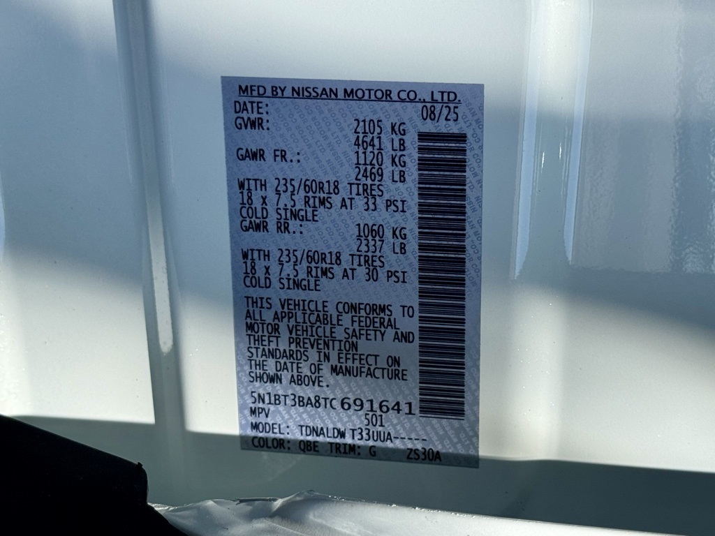 4-Wheel Disc Brakes, 6 Speakers, ABS brakes, Air Conditioning, Alloy wheels, AM/FM radio: Sirius, Apple CarPlay/Android Auto, Auto High-beam Headlights, Automatic temperature control, Black Splash Guards (Set of 4) (B92), Brake assist, Bumpers: body-color, Chrome Rear Bumper Protector, Cloth Seat Trim w/Patterned Inserts, Delay-off headlights, Driver door bin, Driver vanity mirror, Dual front impact airbags, Dual front side impact airbags, Electronic Stability Control, Emergency communication system: NissanConnect Services, First Aid Kit, Floor Mats w/1-Piece Cargo Area Protector, Four wheel independent suspension, Front anti-roll bar, Front Bucket Seats, Front Center Armrest, Front dual zone A/C, Front reading lights, Fully automatic headlights, Heated door mirrors, Illuminated entry, Knee airbag, Low tire pressure warning, Occupant sensing airbag, Outside temperature display, Overhead airbag, Overhead console, Panic alarm, Passenger door bin, Passenger vanity mirror, Power door mirrors, Power driver seat, Power Liftgate, Power steering, Power windows, Premium Paint, Radio data system, Radio: AM/FM NissanConnect, Rear anti-roll bar, Rear seat center armrest, Rear side impact airbag, Rear window defroster, Rear window wiper, Remote keyless entry, Speed control, Speed-sensing steering, Speed-Sensitive Wipers, Split folding rear seat, Spoiler, Steering wheel mounted audio controls, Tachometer, Telescoping steering wheel, Tilt steering wheel, Traction control, Trip computer, Variably intermittent wipers, and Wheels: 18" Dark Painted Machine Finished Alloy. Price includes all rebates: $2500 - Nissan Customer Cash. Exp. 01/05/2026
