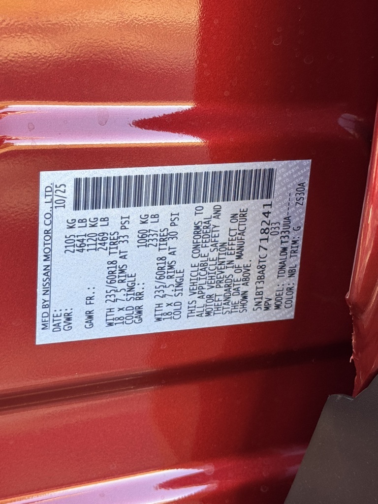 4-Wheel Disc Brakes, 6 Speakers, ABS brakes, Air Conditioning, Alloy wheels, AM/FM radio: Sirius, Apple CarPlay/Android Auto, Auto High-beam Headlights, Automatic temperature control, Black Splash Guards (Set of 4) (B92), Brake assist, Bumpers: body-color, Chrome Rear Bumper Protector, Cloth Seat Trim w/Patterned Inserts, Delay-off headlights, Driver door bin, Driver vanity mirror, Dual front impact airbags, Dual front side impact airbags, Electronic Stability Control, Emergency communication system: NissanConnect Services, First Aid Kit, Floor Mats w/1-Piece Cargo Area Protector, Four wheel independent suspension, Front anti-roll bar, Front Bucket Seats, Front Center Armrest, Front dual zone A/C, Front reading lights, Fully automatic headlights, Heated door mirrors, Illuminated entry, Knee airbag, Low tire pressure warning, Occupant sensing airbag, Outside temperature display, Overhead airbag, Overhead console, Panic alarm, Passenger door bin, Passenger vanity mirror, Power door mirrors, Power driver seat, Power Liftgate, Power steering, Power windows, Premium Paint, Radio data system, Radio: AM/FM NissanConnect, Rear anti-roll bar, Rear seat center armrest, Rear side impact airbag, Rear window defroster, Rear window wiper, Remote keyless entry, Speed control, Speed-sensing steering, Speed-Sensitive Wipers, Split folding rear seat, Spoiler, Steering wheel mounted audio controls, Tachometer, Telescoping steering wheel, Tilt steering wheel, Traction control, Trip computer, Variably intermittent wipers, and Wheels: 18" Dark Painted Machine Finished Alloy. Price includes all rebates: $1500 - Nissan Customer Cash. Exp. 12/01/2025