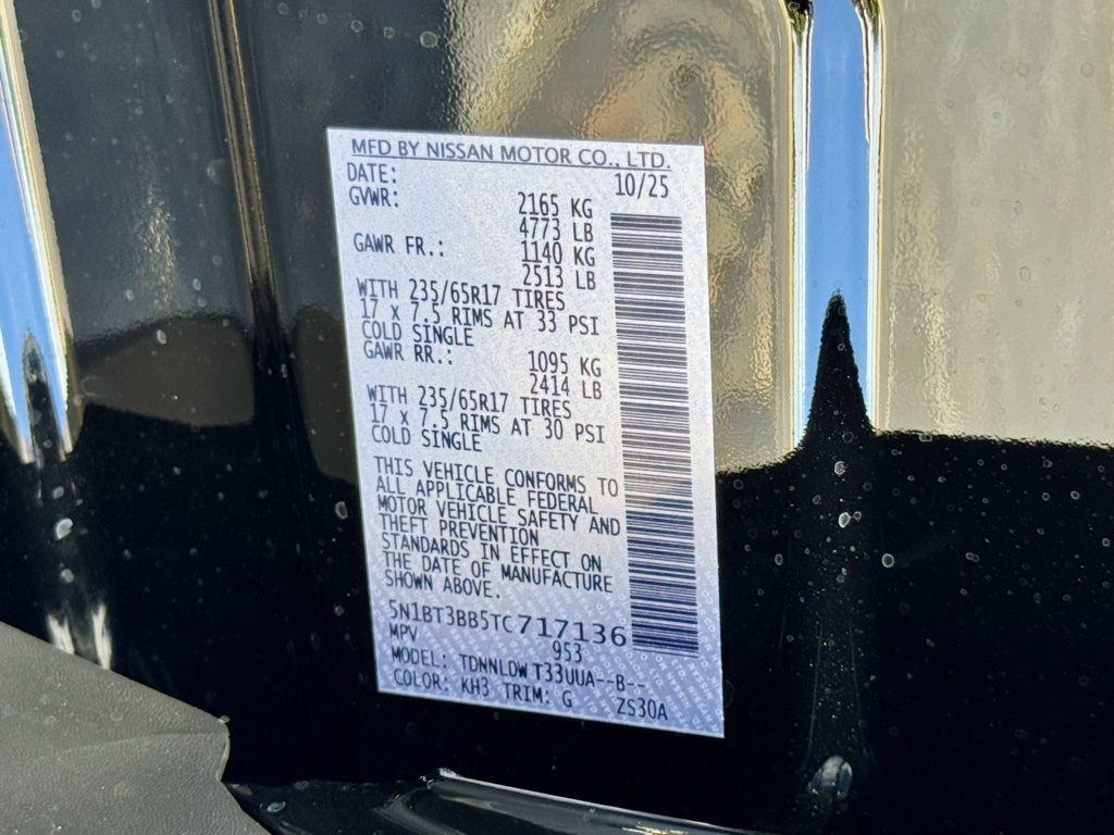 AWD, 4-Wheel Disc Brakes, 6 Speakers, ABS brakes, Air Conditioning, Alloy wheels, AM/FM radio: Sirius, Apple CarPlay/Android Auto, Auto High-beam Headlights, Automatic temperature control, Black Splash Guards (Set of 4) (B92), Brake assist, Delay-off headlights, Driver door bin, Driver vanity mirror, Dual front impact airbags, Dual front side impact airbags, Electronic Stability Control, Emergency communication system: NissanConnect Services, Four wheel independent suspension, Front anti-roll bar, Front Bucket Seats, Front Center Armrest, Front dual zone A/C, Front reading lights, Fully automatic headlights, Heated door mirrors, Heated Front Bucket Seats, Heated front seats, Illuminated entry, Knee airbag, Leatherette & Ballistic Nylon Seating, Low tire pressure warning, Occupant sensing airbag, Outside temperature display, Overhead airbag, Overhead console, Panic alarm, Passenger door bin, Passenger vanity mirror, Power door mirrors, Power driver seat, Power Liftgate, Power steering, Power windows, Radio data system, Radio: AM/FM NissanConnect, Rear anti-roll bar, Rear seat center armrest, Rear side impact airbag, Rear window defroster, Rear window wiper, Remote keyless entry, Roof rack, Speed control, Speed-sensing steering, Speed-Sensitive Wipers, Split folding rear seat, Spoiler, Steering wheel mounted audio controls, Tachometer, Telescoping steering wheel, Tilt steering wheel, Traction control, Trip computer, Variably intermittent wipers, and Wheels: 17" Dark Painted Alloy. Price includes all rebates: $1500 - Nissan Customer Cash. Exp. 12/01/2025