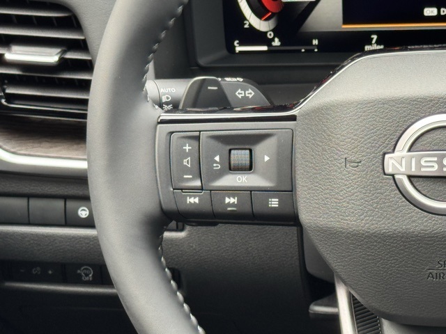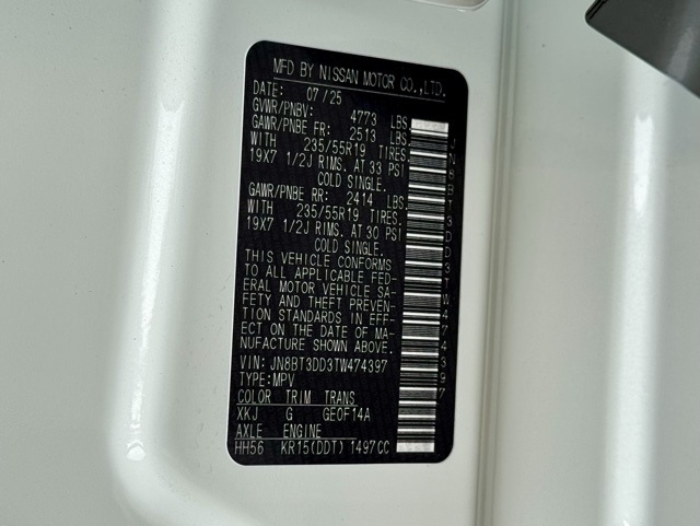 Platinum Premium Package (Head-Up Display, Heated Rear Seats, Motion-Activated Power Liftgate, and Tri-Zone Automatic Temperature Control), 10 Speakers, 4-Wheel Disc Brakes, ABS brakes, Air Conditioning, Alloy wheels, AM/FM radio: SiriusXM w/360L, Auto High-beam Headlights, Auto-dimming Rear-View mirror, Automatic temperature control, Black Splash Guards (set of 4), Bose Premium Audio System, Brake assist, Bumpers: body-color, Chrome Rear Bumper Protector, Delay-off headlights, Driver door bin, Driver vanity mirror, Dual front impact airbags, Dual front side impact airbags, Electronic Stability Control, Emergency communication system: NissanConnect Services, First Aid Kit, Floor Mats with 2-Piece Cargo Area Protector, Four wheel independent suspension, Front anti-roll bar, Front Bucket Seats, Front Center Armrest, Front dual zone A/C, Front reading lights, Fully automatic headlights, Garage door transmitter: myQ Connected Garage, Heads-Up Display, Heated door mirrors, Heated Front Bucket Seats, Heated front seats, Heated steering wheel, Illuminated entry, Knee airbag, Low tire pressure warning, Memory seat, Navigation system: Google Maps, Occupant sensing airbag, Outside temperature display, Overhead airbag, Overhead console, Panic alarm, Passenger door bin, Passenger vanity mirror, Power door mirrors, Power driver seat, Power Liftgate, Power moonroof, Power passenger seat, Power steering, Power windows, Premium Paint with Two-Tone, Quilted Semi-Aniline Leather-Appointed Seat Trim, Radio data system, Radio: AM/FM NissanConnect with Navigation, Rear anti-roll bar, Rear reading lights, Rear seat center armrest, Rear side impact airbag, Rear window defroster, Rear window wiper, Remote keyless entry, Roof Rail Cross Bars, Security system, Speed control, Speed-sensing steering, Speed-Sensitive Wipers, Split folding rear seat, Spoiler, Steering wheel mounted audio controls, Tachometer, Telescoping steering wheel, Tilt steering wheel, Traction control, Trip computer, Turn signal indicator mirrors, Variably intermittent wipers, Wheels: 19" Unique Dark Painted Aluminum Alloy, and Wireless Apple CarPlay/Wireless Android Auto.