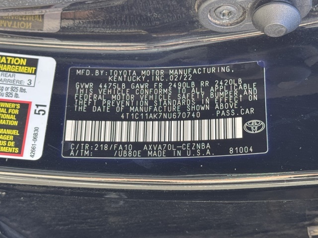 28/39 City/Highway MPG CARFAX One-Owner. Miracle Toyota of North Augusta is proud to offer this terrific 2022 Toyota Camry in Midnight Black Metallic This vehicle has passed our comprehensive inspection and comes with the following 4-Wheel Disc Brakes, 6 Speakers, 7.5J x 17" Alloy Wheels, ABS brakes, Air Conditioning, Alloy wheels, AM/FM radio: SiriusXM, Apple CarPlay/Android Auto, Auto High-beam Headlights, Automatic temperature control, Brake assist, Bumpers: body-color, Delay-off headlights, Driver door bin, Driver vanity mirror, Dual front impact airbags, Dual front side impact airbags, Electronic Stability Control, Emergency communication system: Safety Connect with 1-year trial, Exterior Parking Camera Rear, Fabric Seat Trim, Four wheel independent suspension, Front anti-roll bar, Front Bucket Seats, Front Center Armrest, Front dual zone A/C, Front reading lights, Fully automatic headlights, Illuminated entry, Knee airbag, Low tire pressure warning, Occupant sensing airbag, Outside temperature display, Overhead airbag, Overhead console, Panic alarm, Passenger door bin, Passenger vanity mirror, Power door mirrors, Power driver seat, Power steering, Power windows, Radio data system, Radio: AM/FM Audio System, Rear anti-roll bar, Rear seat center armrest, Rear side impact airbag, Rear window defroster, Remote keyless entry, Security system, Speed control, Speed-sensing steering, Split folding rear seat, Steering wheel mounted audio controls, Tachometer, Telescoping steering wheel, Tilt steering wheel, Traction control, Trip computer, and Variably intermittent wipers;
